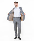 The Avalon Collection Sharkskin Two-Piece Suit in earth tan offers a natural, warm tone that complements any season. Its earthy color provides a unique alternative to traditional suit colors, making it an excellent choice for outdoor weddings or summer events.