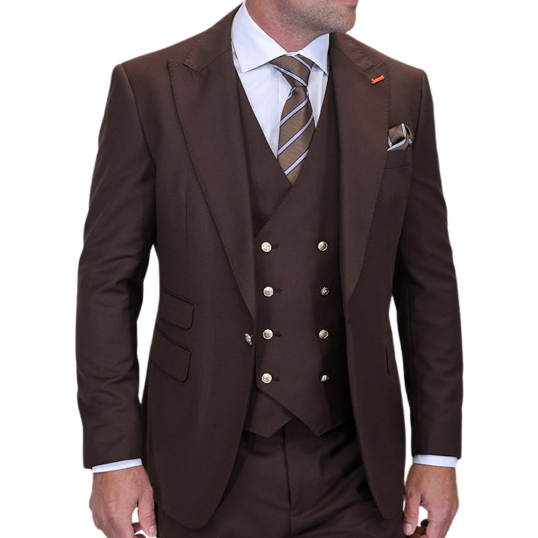 Powerful and poised, the Aether Crest Collection delivers elevated formalwear for the modern gentleman. Tailored from luxurious Italian Super 200’s wool, this 3-piece modern fit suit blends traditional craftsmanship with sharp, contemporary lines. A single-breasted jacket and double-breasted vest both feature striking gold button accents, adding a touch of regal flair. The peak lapel enhances the jacket’s structure, while the flat front pants complete the look with clean, confident styling. Whether you're attending a formal event or making a commanding entrance at a special occasion, this suit ensures you’ll leave a lasting impression. If you prefer a more relaxed fit, consider sizing up for added ease.