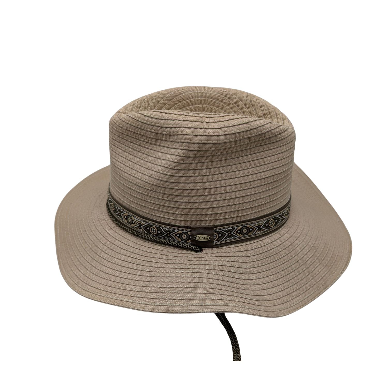 Low Country Collection: Scala Khaki Pinch Front Ribbon Safari Hat with Chin Cord and 3 1/4 Inch Brim