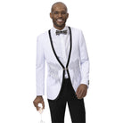 This white blazer makes a bold entrance with its sweeping rhinestone design and sleek black trim. A silver clasp closure at the front adds a unique touch of flair, while the shawl-style collar brings a sharp finish.