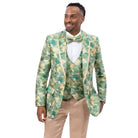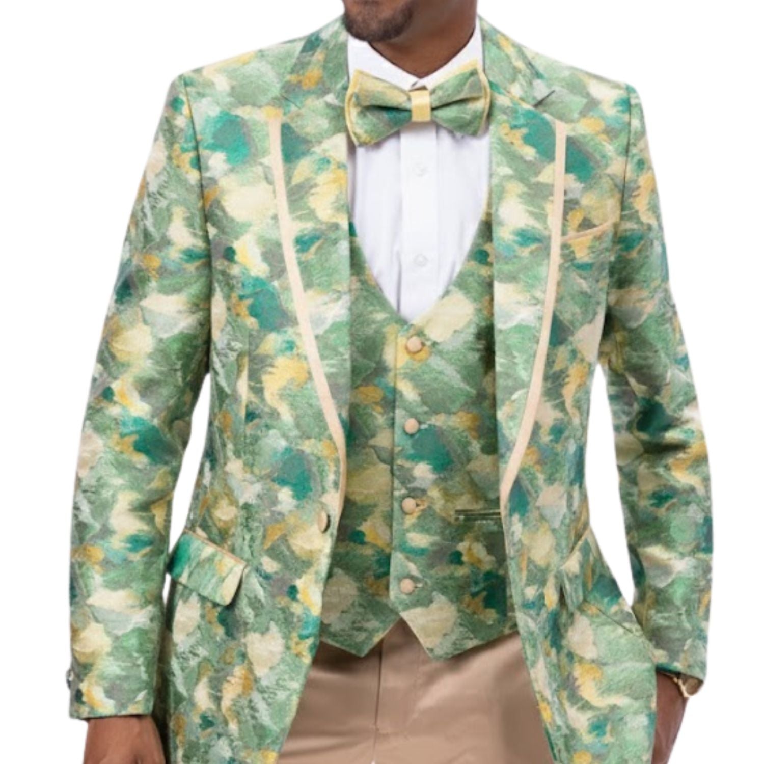 This eye-catching green ensemble brings bold personality with a painterly pattern and soft contrast trim. Complete with a coordinating vest and matching bowtie, it’s an all-in-one look built for standout style.