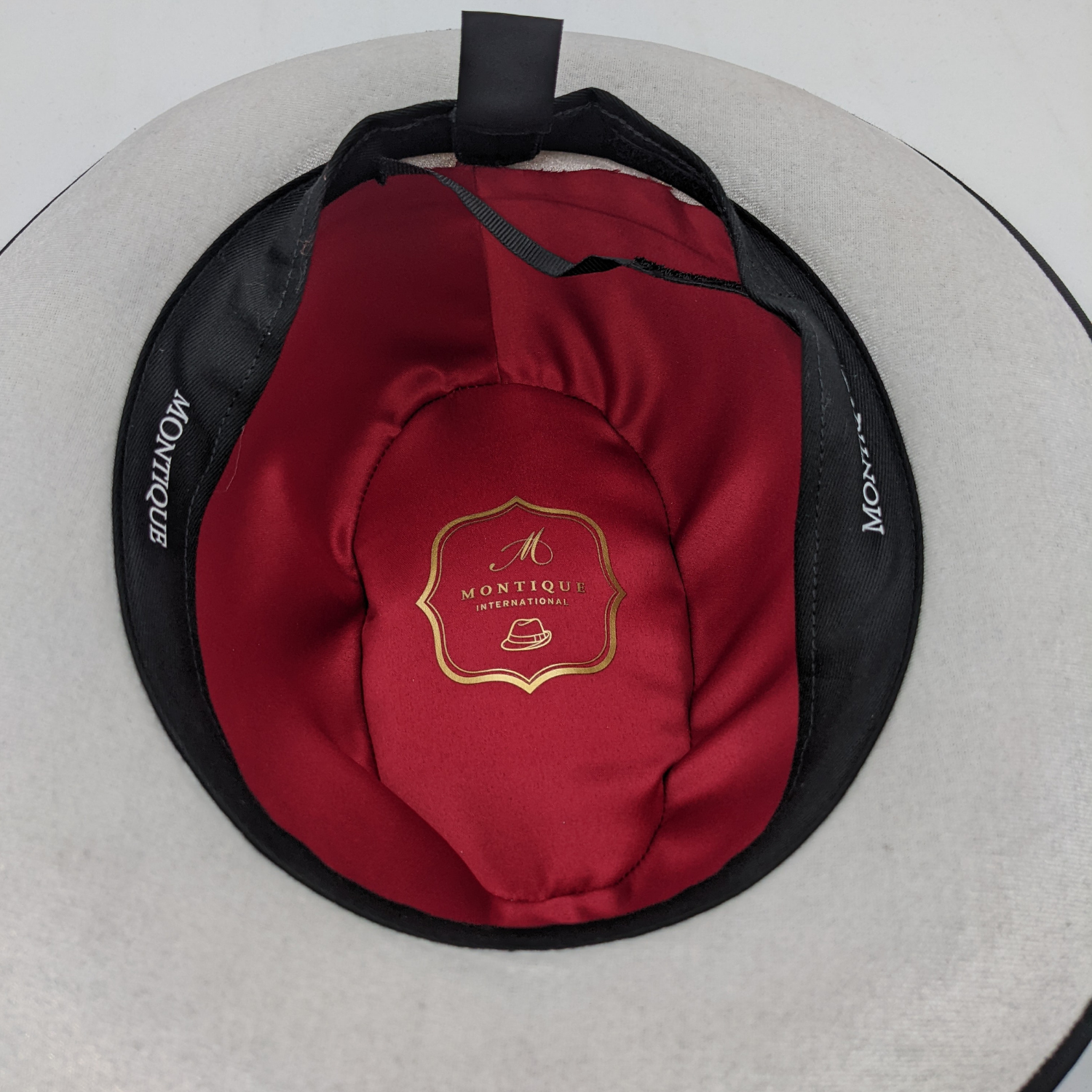 The hat comes equipped with a luxurious lining, ensuring a comfortable fit throughout the day. It also features a Velcro size adjuster for a perfect fit, accommodating various head sizes with ease. Embellished with a signature Montique pin and a tasteful feather accent, this hat is the epitome of sophistication and flair.