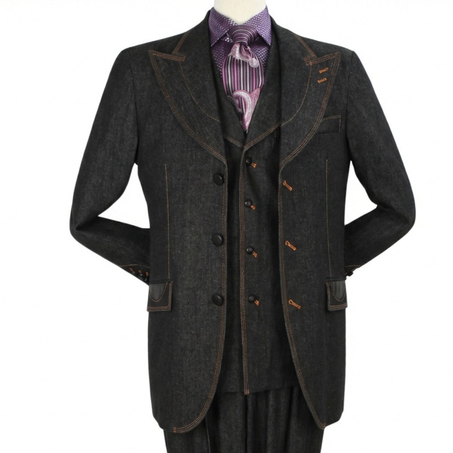 Black 3-Piece Long Sleeve Regular Fit Fashion Denim Suit - DEN8