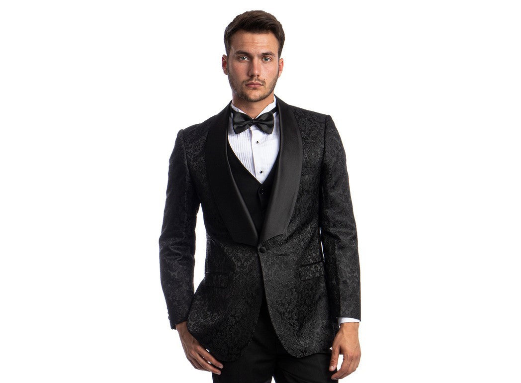 Introducing the Gallant Grove Black Paisley Three-Piece Suit, a stunning ensemble that combines timeless elegance with a modern twist. This suit features a hybrid fit jacket adorned with a paisley pattern and a satin shawl collar, offering a unique blend of sophistication and contemporary style. The solid black vest and trousers complement the jacket's detailed design, creating a seamless look perfect for formal events or stylish evenings out.