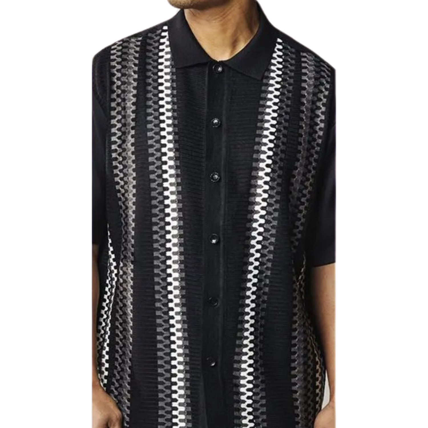 Vardos Collection: Men's Black & White 2-Piece Short Sleeve Set with Vertical Textured Stripes