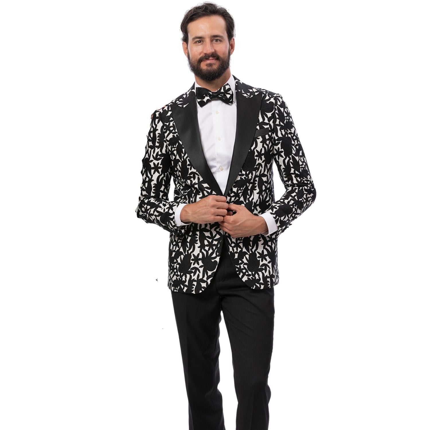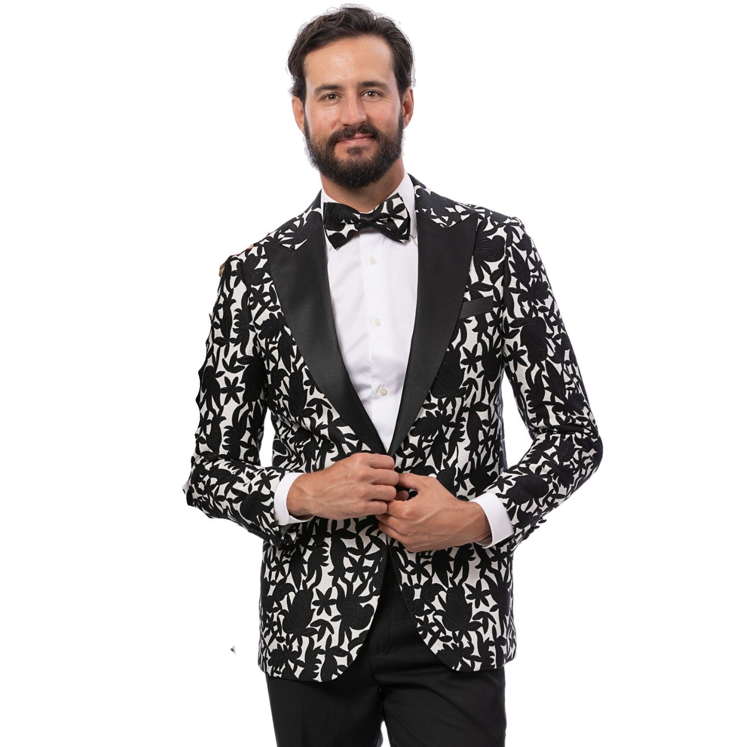 Elegant Black Tone on Tone Floral Design Blazer with Solid Satin Lapel - Modern Fit