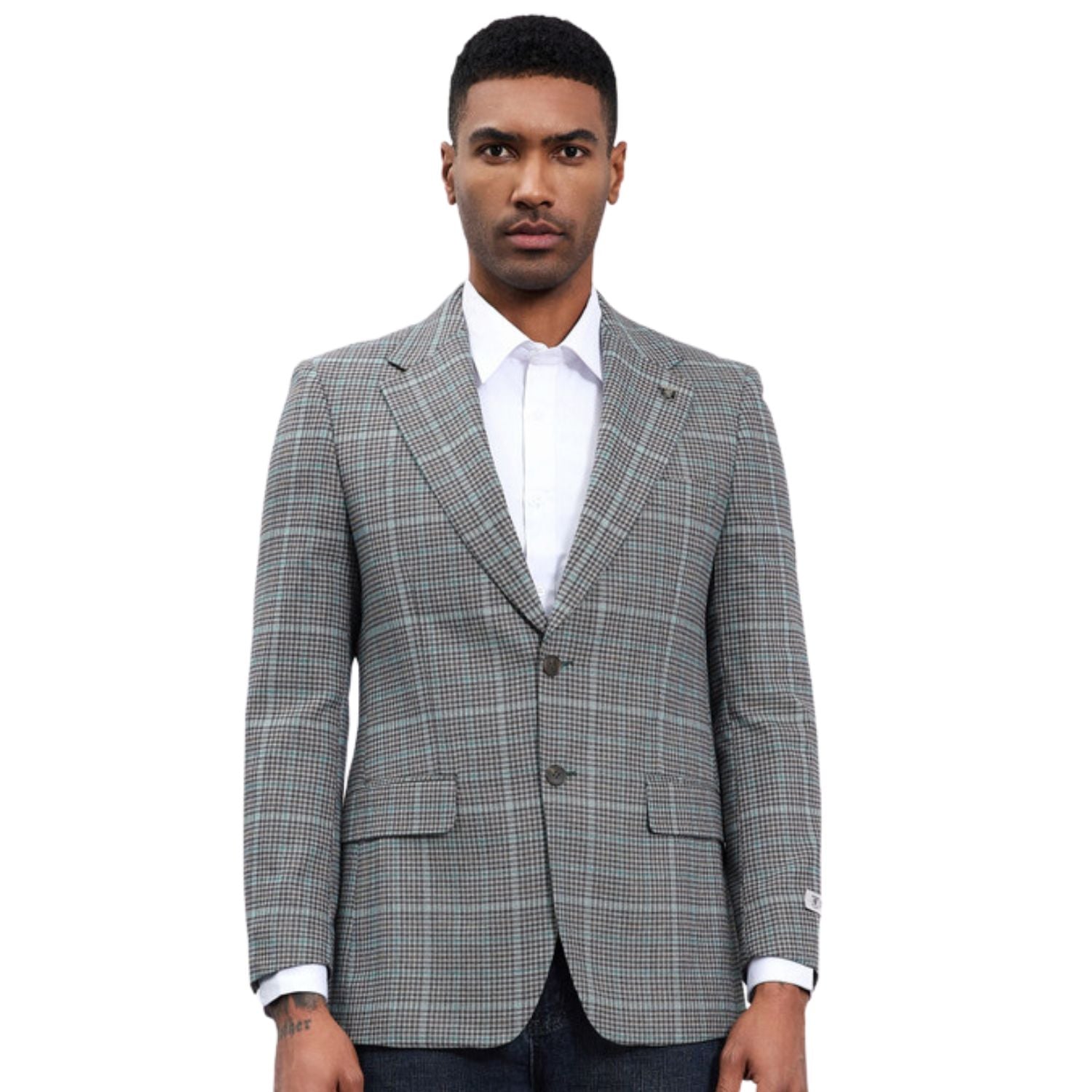 The Zaurak Collection is where classic tailoring meets modern versatility. This grey windowpane plaid blazer brings a refined touch to any outfit, whether dressed up with trousers or styled casually with denim. Perfect for a polished yet relaxed look.