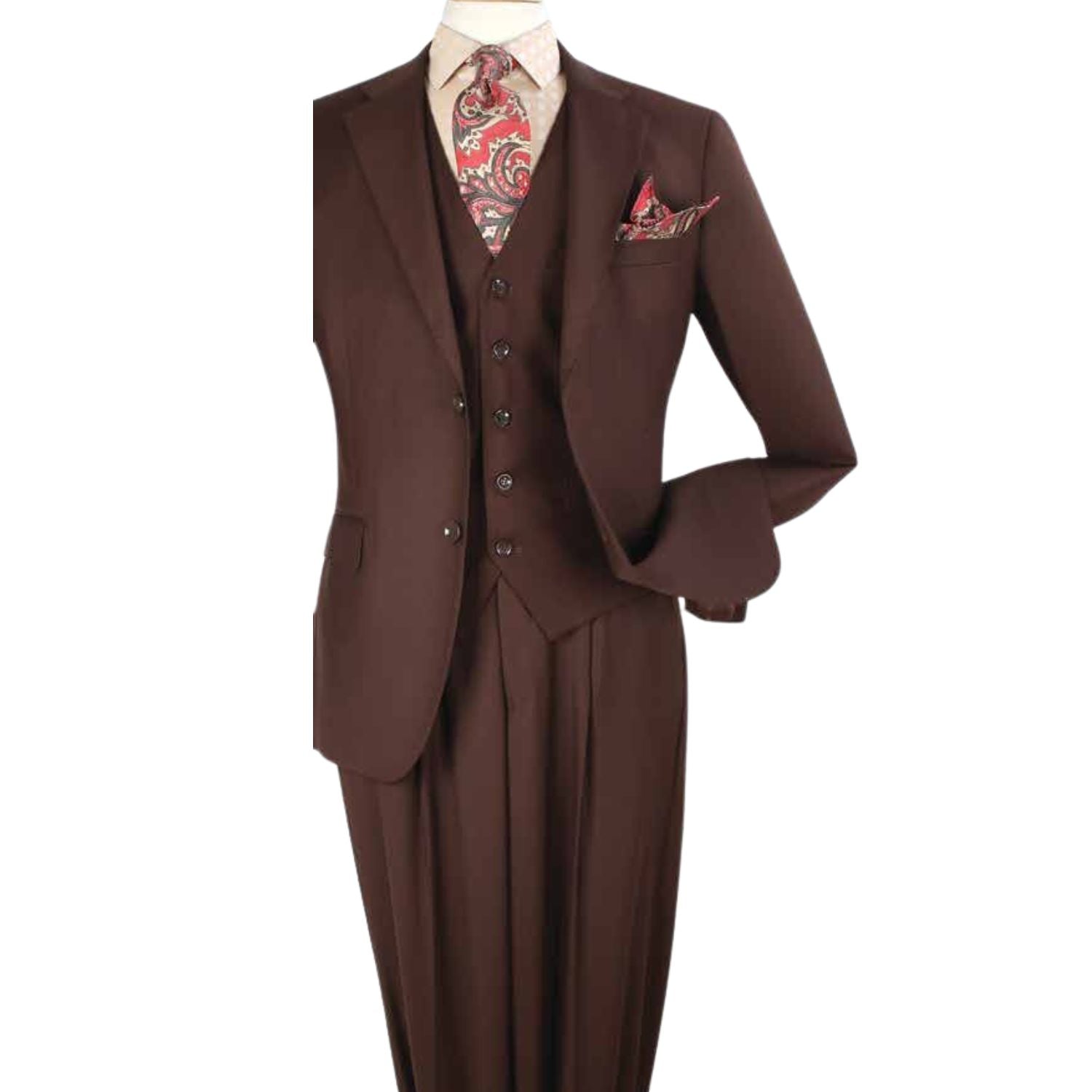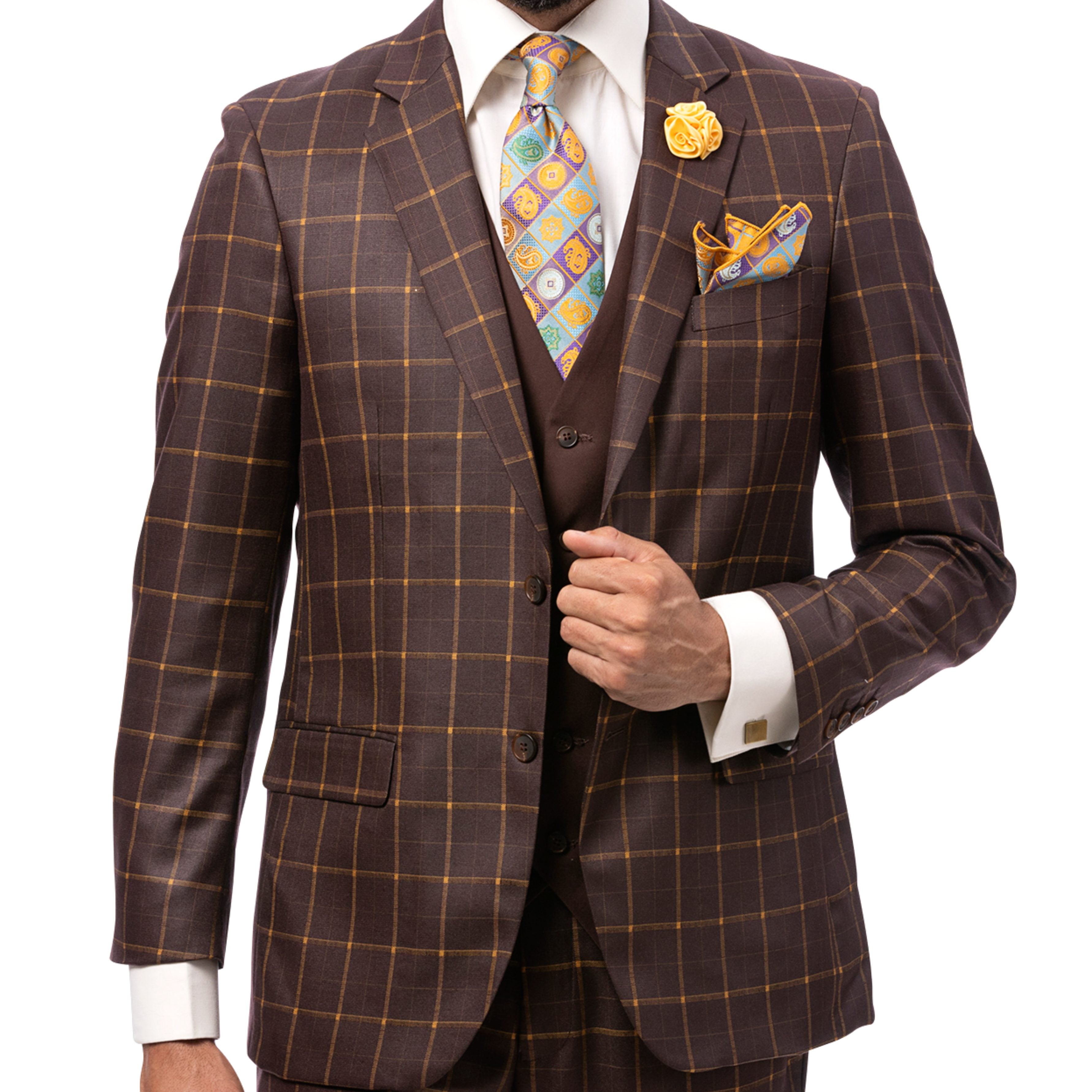 Mavix Collection: 3-Piece Modern Fit Suit with Built-In Pocket Square and Lapel Pin in Brown