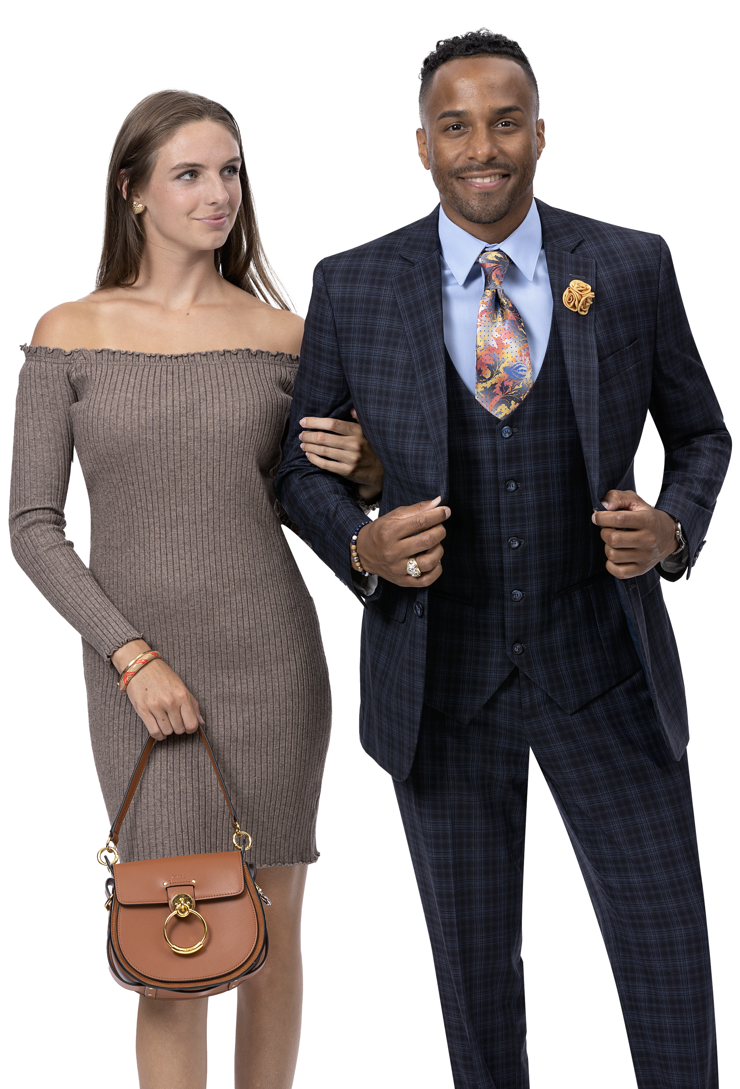 DrapeDreams Collection: Blue 3 Piece Plaid with Solid Color Vest Modern Fit Suit - FINAL SALE Size 52L/47 Waist