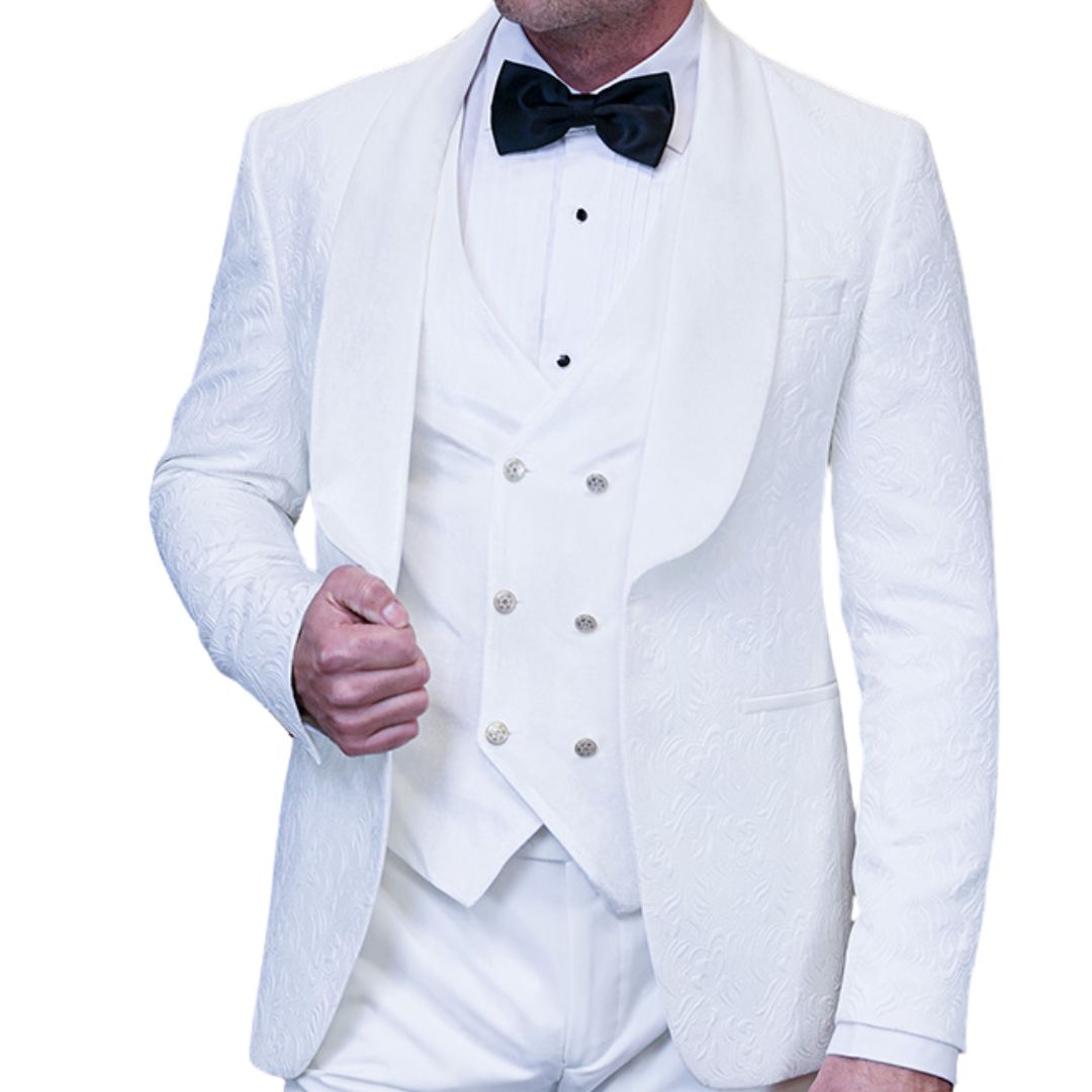 Elevate your formalwear with the Empyrean Collection—a bold blend of sophistication and contemporary tailoring. This White 3-piece slim fit tuxedo is designed for the modern gentleman who commands attention with effortless style. Featuring a White velvet shawl lapel, gold button accents, and side-trimmed pants, this suit is the epitome of luxury and refinement.