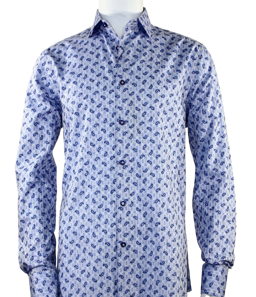Blue Leaf Pattern Printed Long Sleeve Button-Up Cotton Shirt