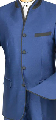FabricFantasy Collection: Blue 2 Piece Banded Collar Sharkskin Single Breasted Slim Fit Suit