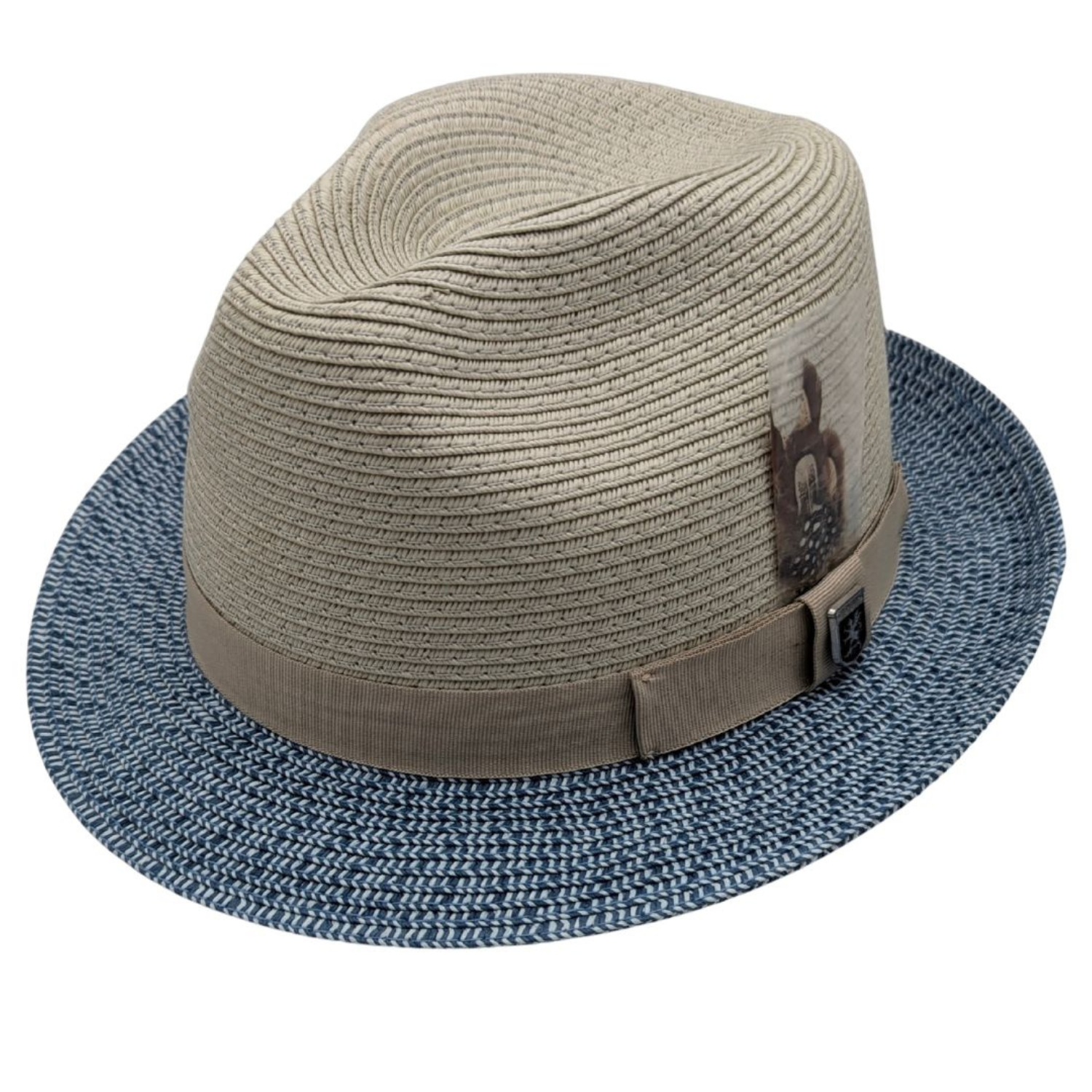 Lamonte Collection: Scala Blue Paper Braid Fedora with Feather and Grosgrain Band