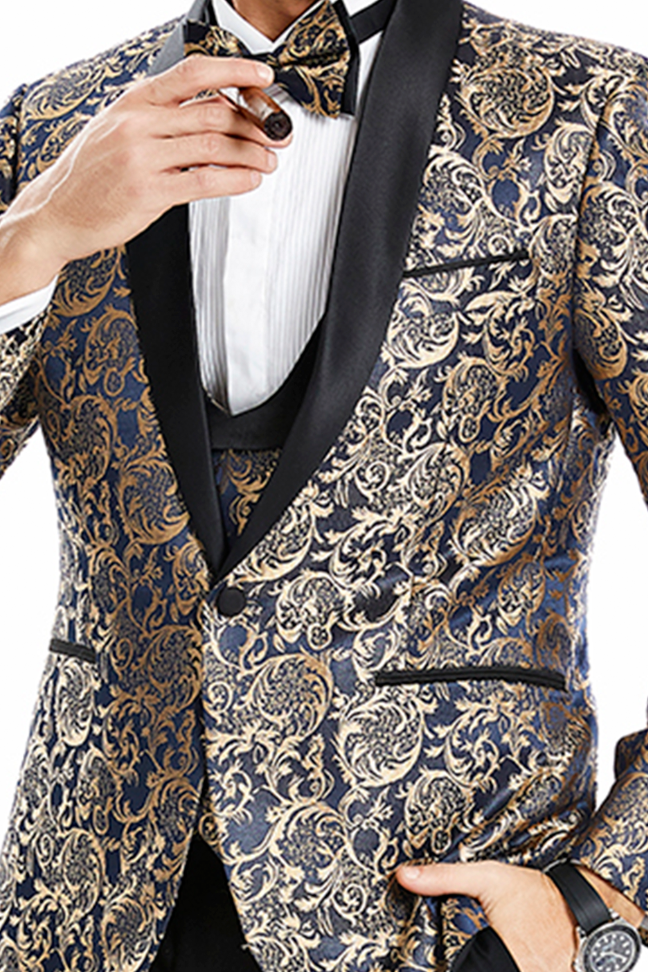 Keats Collection: Men's 3-Piece Blue/Black Gold Paisley Suit - Slim Fit