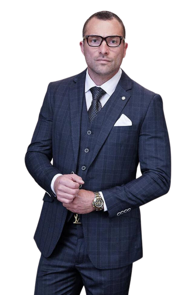 Barnard Collection: Men's Single Breasted Slim Fit Windowpane 3-Piece Suit in Grey