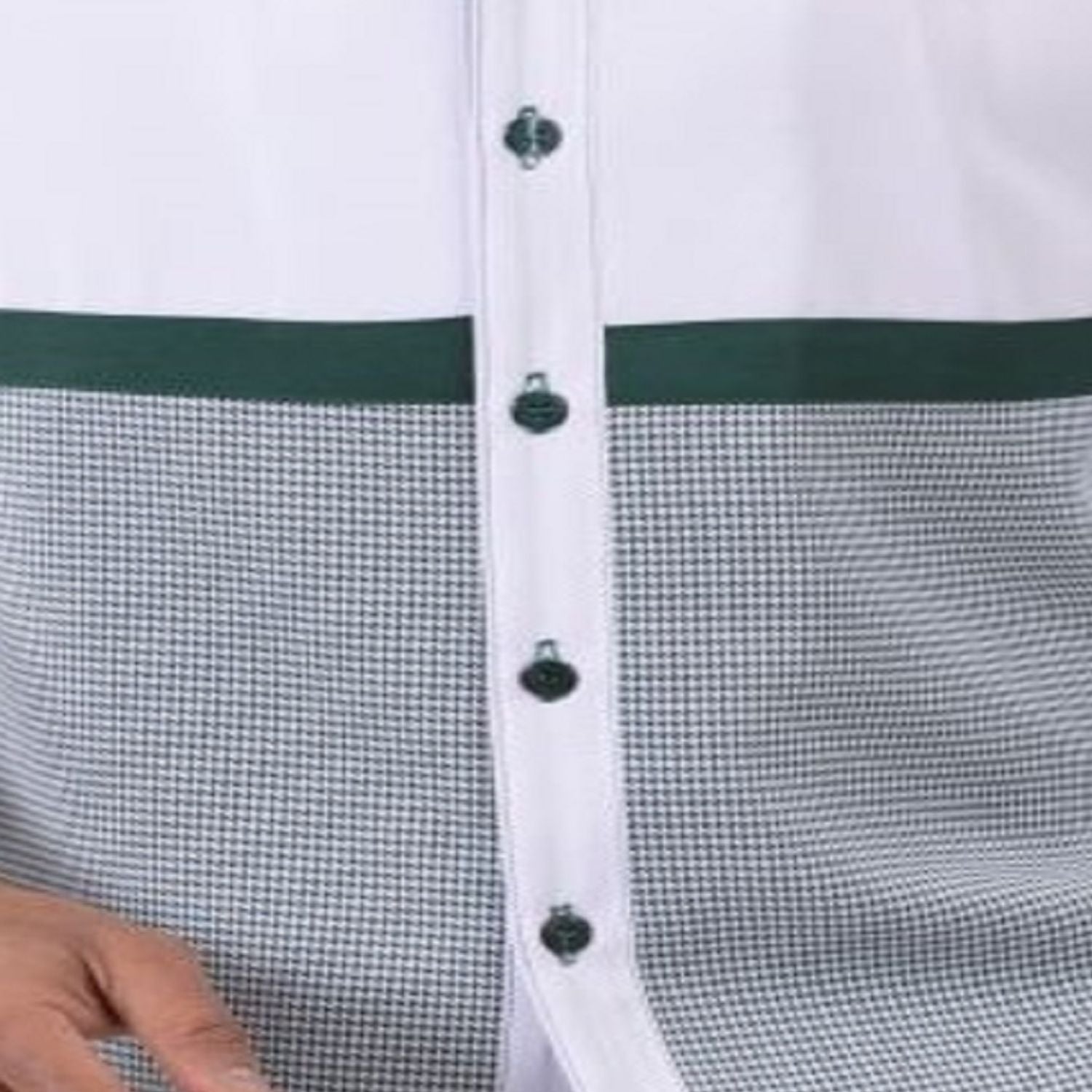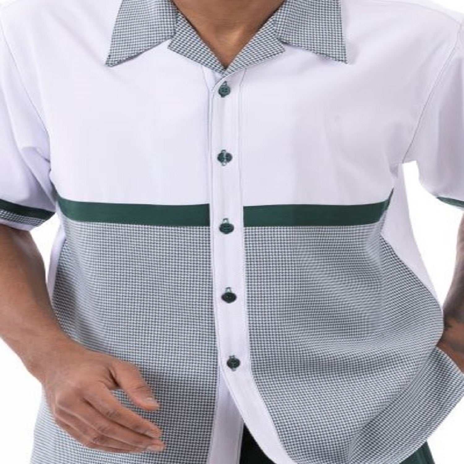The short-sleeve button-down shirt features an open collar and a bold horizontal houndstooth pattern, creating a structured yet breathable design. The solid-colored accents contrast beautifully with the patterned front, adding a contemporary edge. The set is completed with non-pleated pants for a clean, tailored fit. The lightweight polyester fabric ensures all-day comfort while maintaining a refined look, making this walking suit an essential addition to your wardrobe.