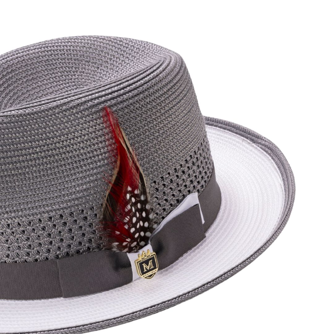 The Dionysia Collection by Montique redefines classic elegance with a refined two-tone fedora design. Featuring a deep grey crown contrasted by a crisp white brim, these fedoras create a striking visual balance that stands out in any setting. Crafted with a tightly woven upper texture and a ventilated open-weave lower crown, they provide exceptional breathability for all-day comfort. The grey grosgrain band with a double bow, adorned with Montique’s signature crest pin, adds a touch of sophistication, while a bold feather accent in deep red and black polka dots brings an unmistakable flair. Designed for both formal and casual occasions, the Dionysia Collection offers effortless style with a polished edge.