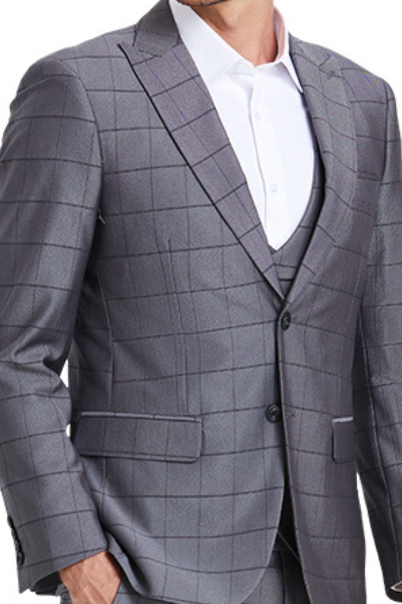 Poseidon Collection: 3-Piece Slim Fit Windowpane Suit For Men In Grey