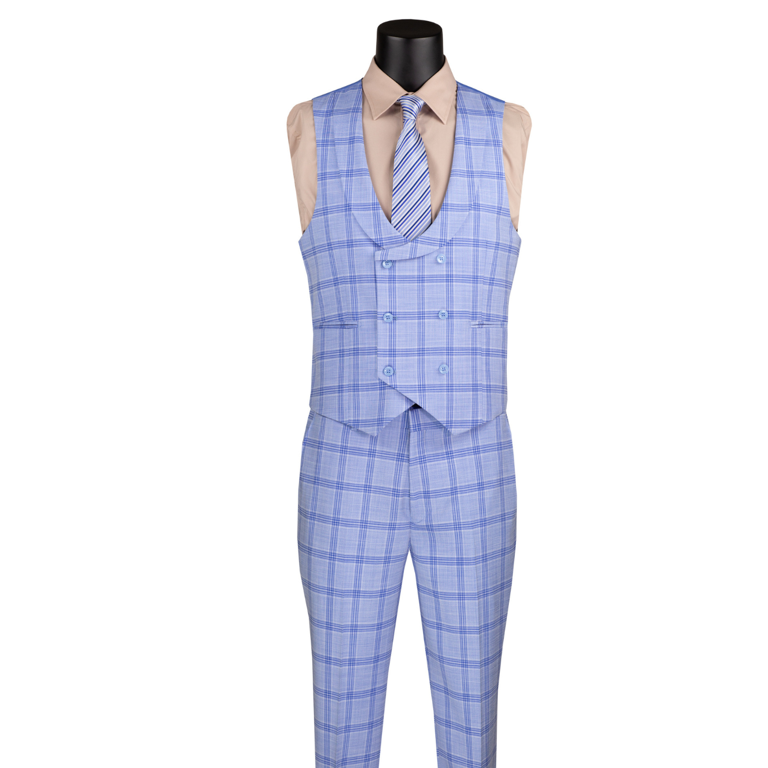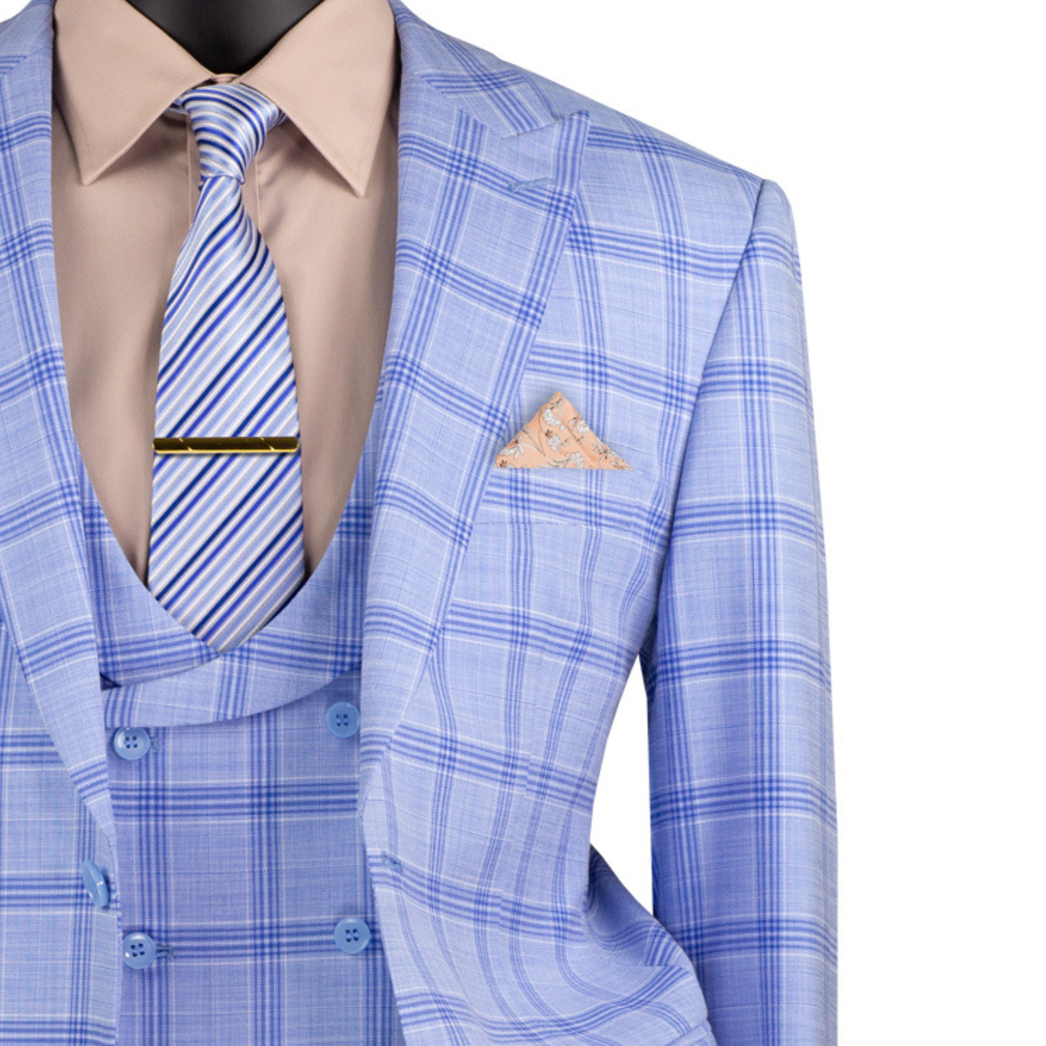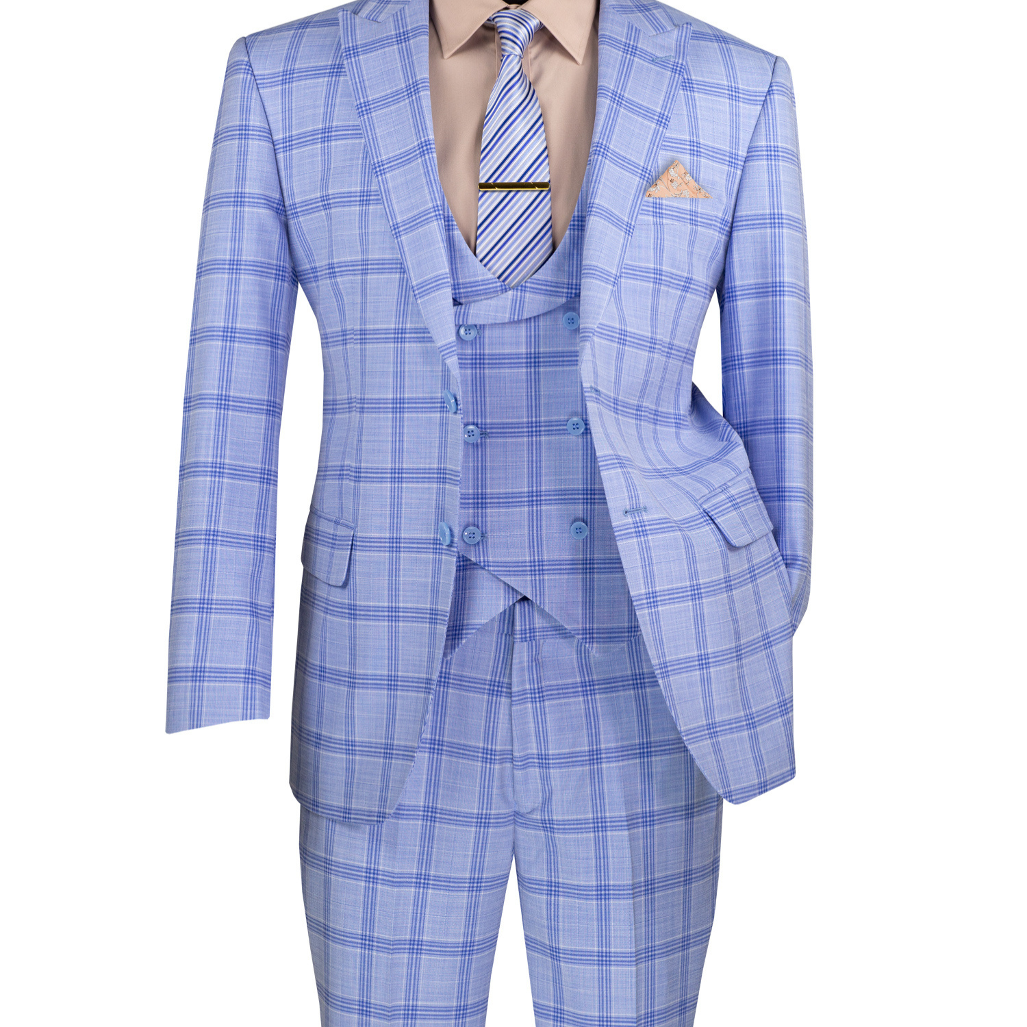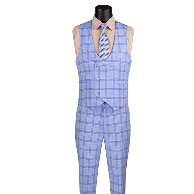 Bellanor Collection: Light Blue 3-Piece Windowpane Modern Fit Suit with Peak Lapel