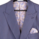 Two-piece double-breasted suit in dusty purple with a luxury wool-feel hand. Jacket features a 6-button front, side vents, fancy lining, and a built-in pocket square. Flat-front pants. Subtle sharkskin finish gives the fabric a clean, lightly lustrous look.