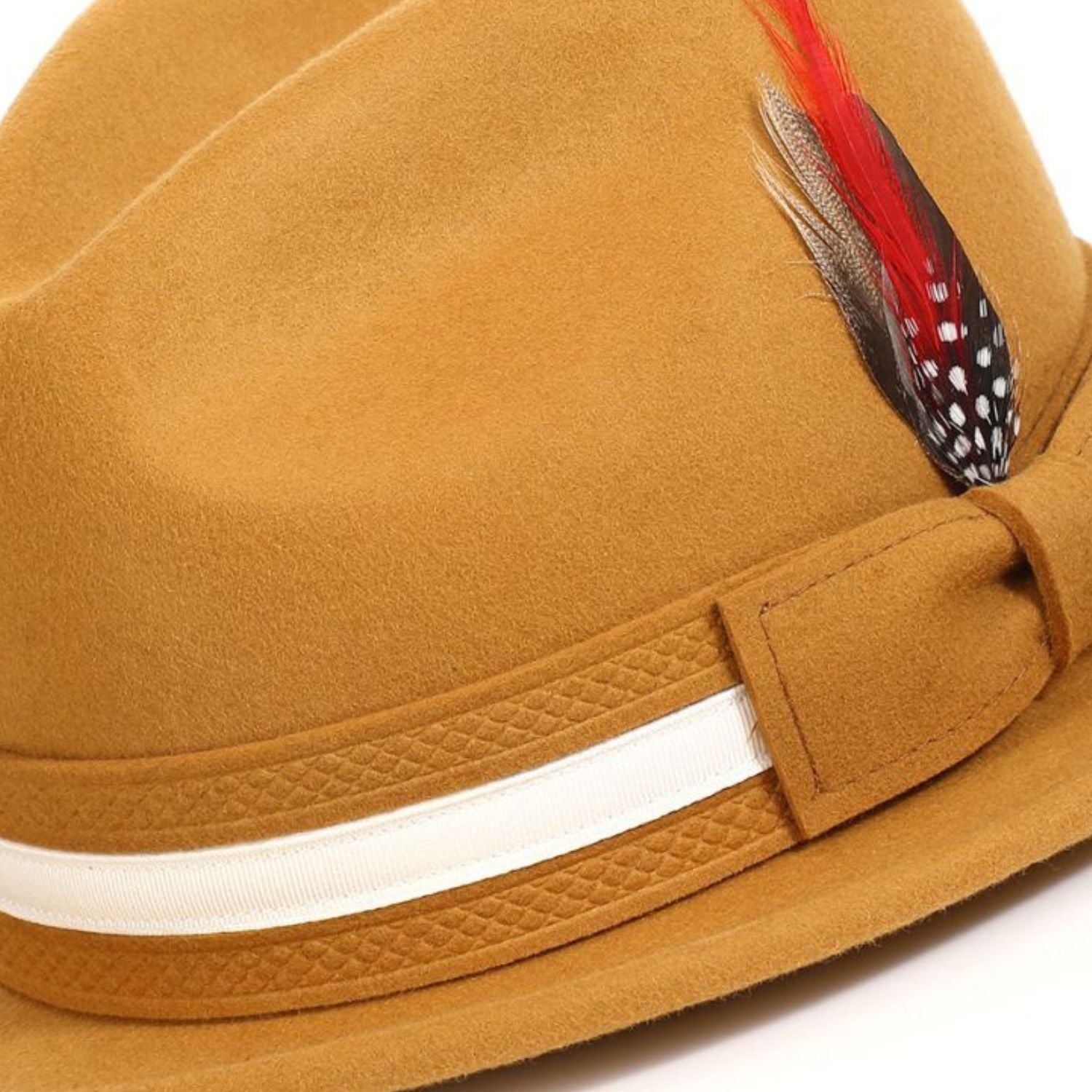 Sablier Collection: Montique Gold Felt Fedora with White Band and Red Feather