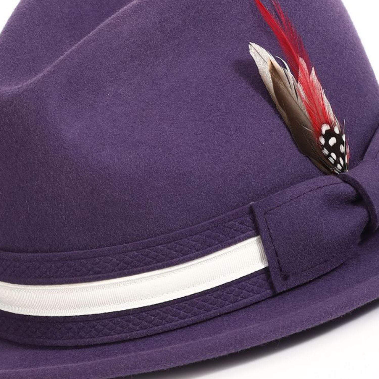 Sablier Collection: Montique Grape Felt Fedora with White Band and Red Feather