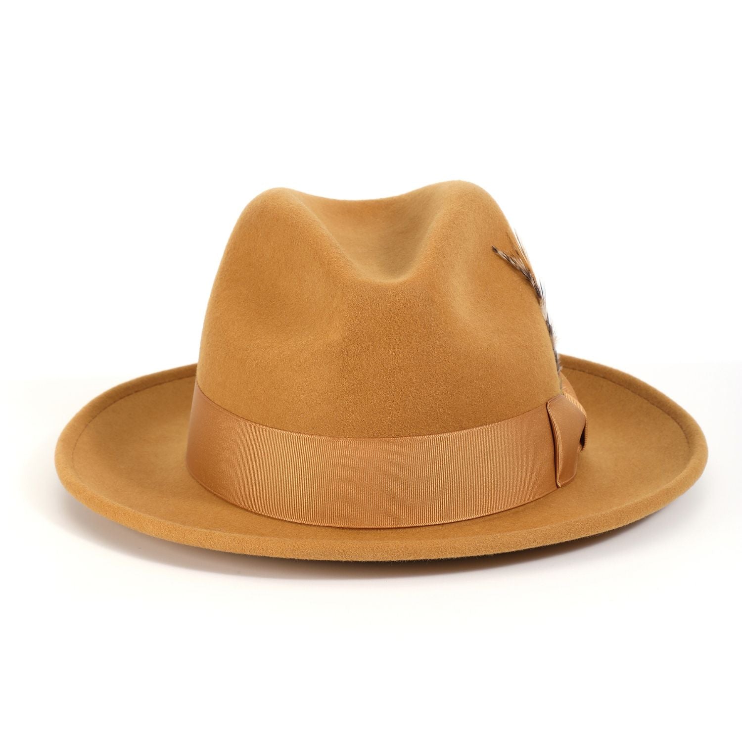 Upgrade your hat game with our Montique Gold Lightfelt 2 ½" Wide Brim Wool Felt Pinch Hat featuring a stylish feather accent. Crafted from 100% wool, this hat boasts a sophisticated pinch crown design and a classic 2 1/2" brim. Complete with a grosgrain ribbon for added charm, this hat exudes elegance and style. With no lining, it's lightweight and comfortable for all-day wear.