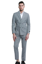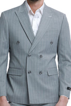 Jacket: The double-breasted jacket, designed with a modern twist on the classic pin stripe, features a two-button closure and peak lapels for a refined look. Side flap pockets and a chest pocket add functionality without compromising style.