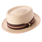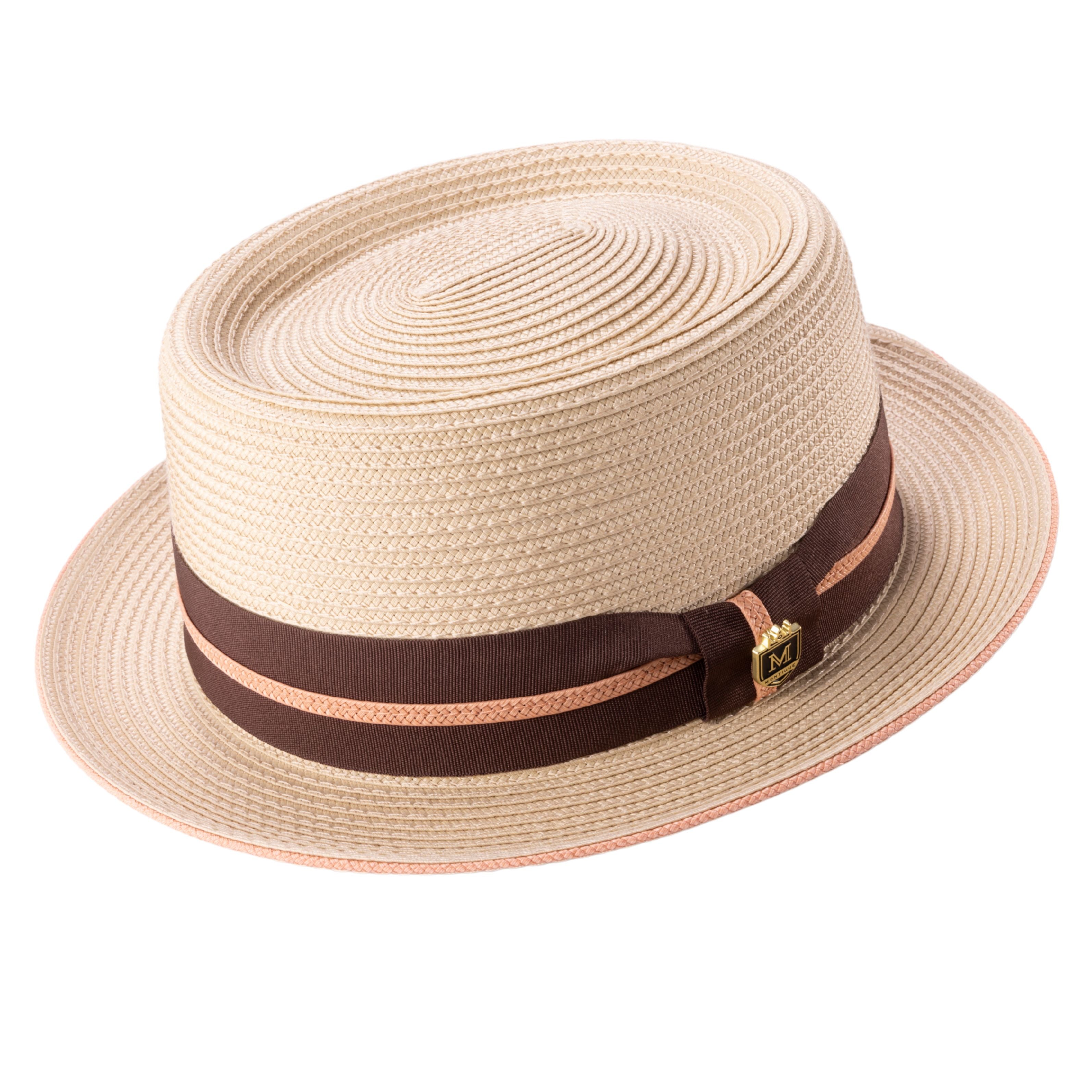 The Henize Collection brings a refined touch to classic headwear with this distinguished Beige pork pie hat. Its structured, tightly woven design offers a sleek and polished look, perfect for those who appreciate timeless style with a hint of contemporary flair. The hat is accented with a brown grosgrain ribbon, featuring a double stripe detail in soft pink, adding just the right amount of contrast. Finished with Montique’s signature crest pin, this piece blends elegance and personality, making it a perfect addition to any wardrobe.