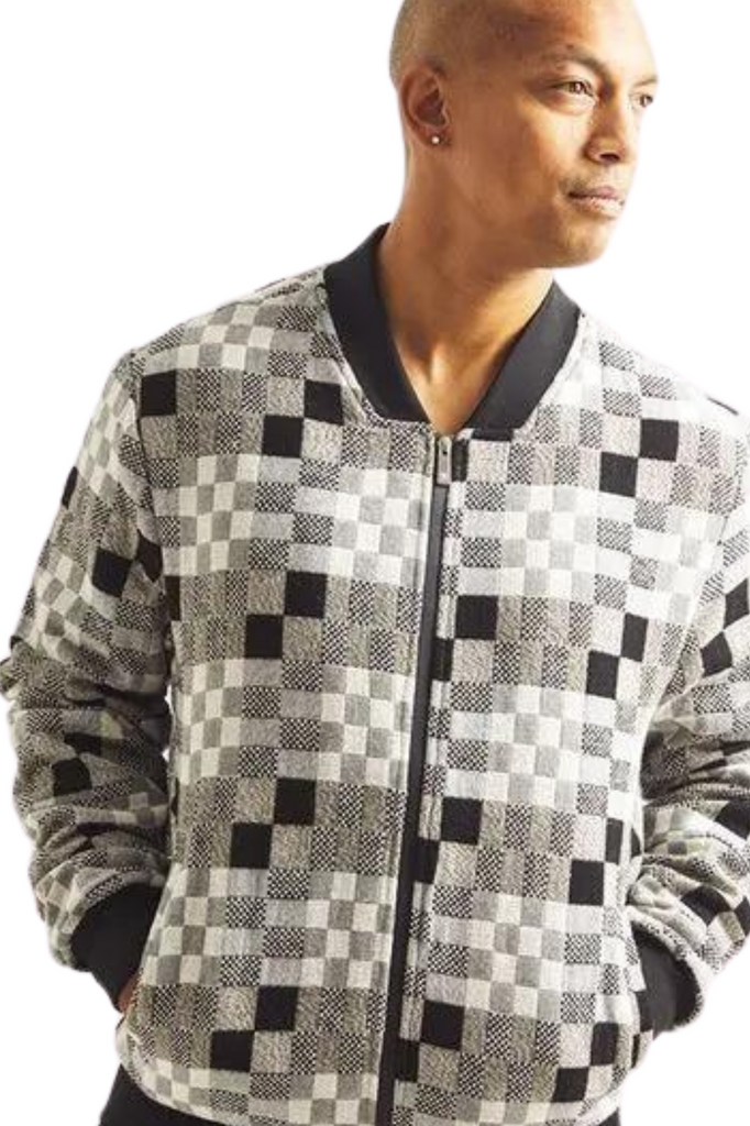 Gents Geo Square Plaid Bomber Full Cut Jacket In Black