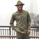 Two-piece walking suit featuring a olive long sleeve shirt with a woven checkerboard jacquard pattern. Includes solid matching pants. Shirt has an open collar, button-front design, and a regular fit. Pants are designed to coordinate cleanly with the shirt.