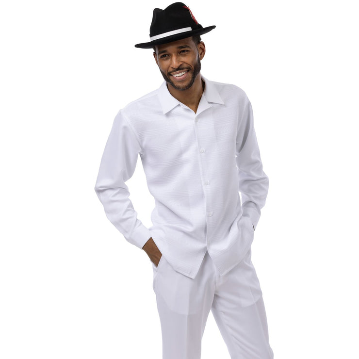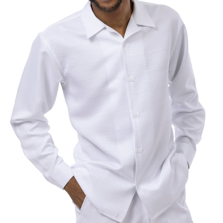 This 2-piece walking suit set includes a white long sleeve shirt with a tone-on-tone horizontal stripe texture and a matching pair of solid white pants. The shirt features a button front and open collar. Designed for a clean, coordinated look with subtle detailing.