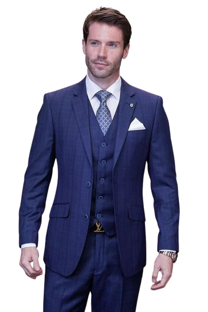 ElegantEcho Collection: Navy 3 Piece Glen Plaid Single Breasted Regular Fit Suit