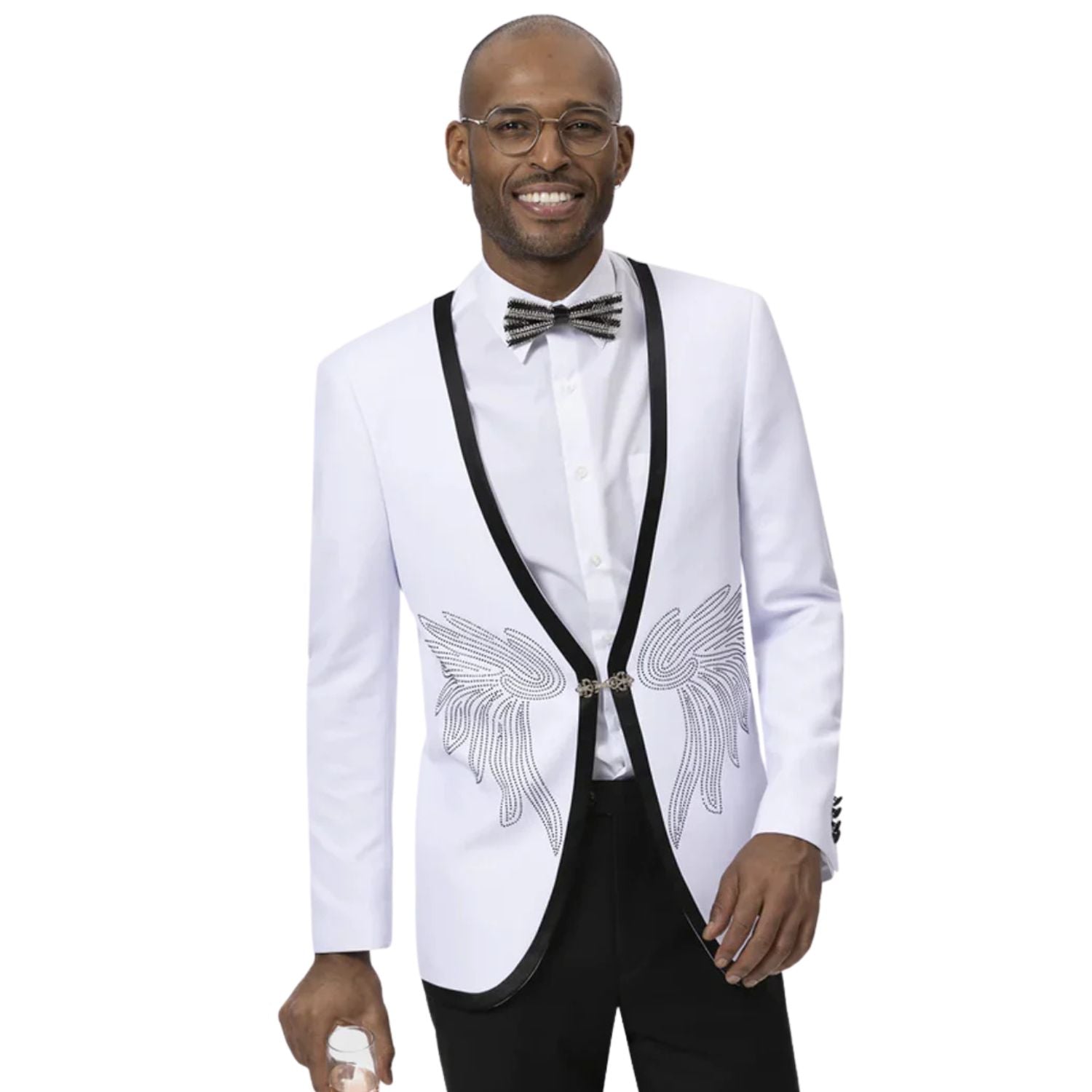 Celaeno Collection: White Collarless Tuxedo Jacket Modern Fit with Black Trim and Diamond Wing Studs