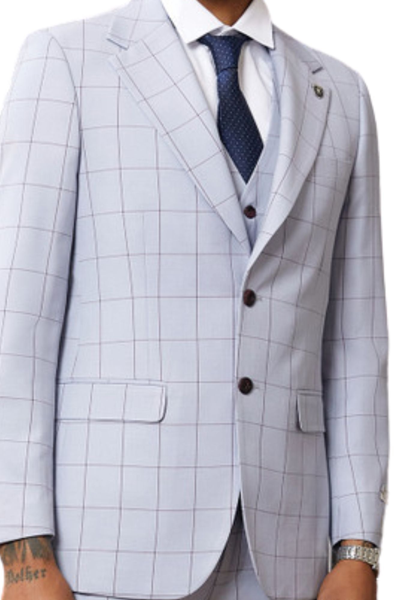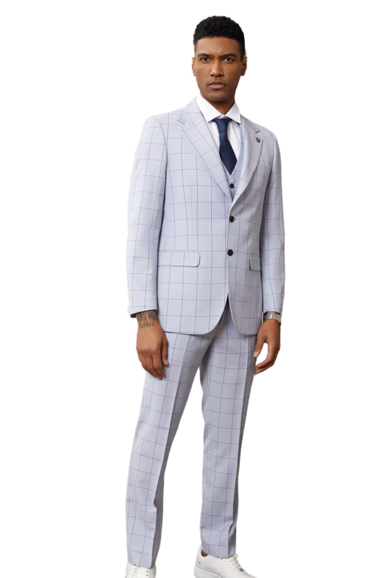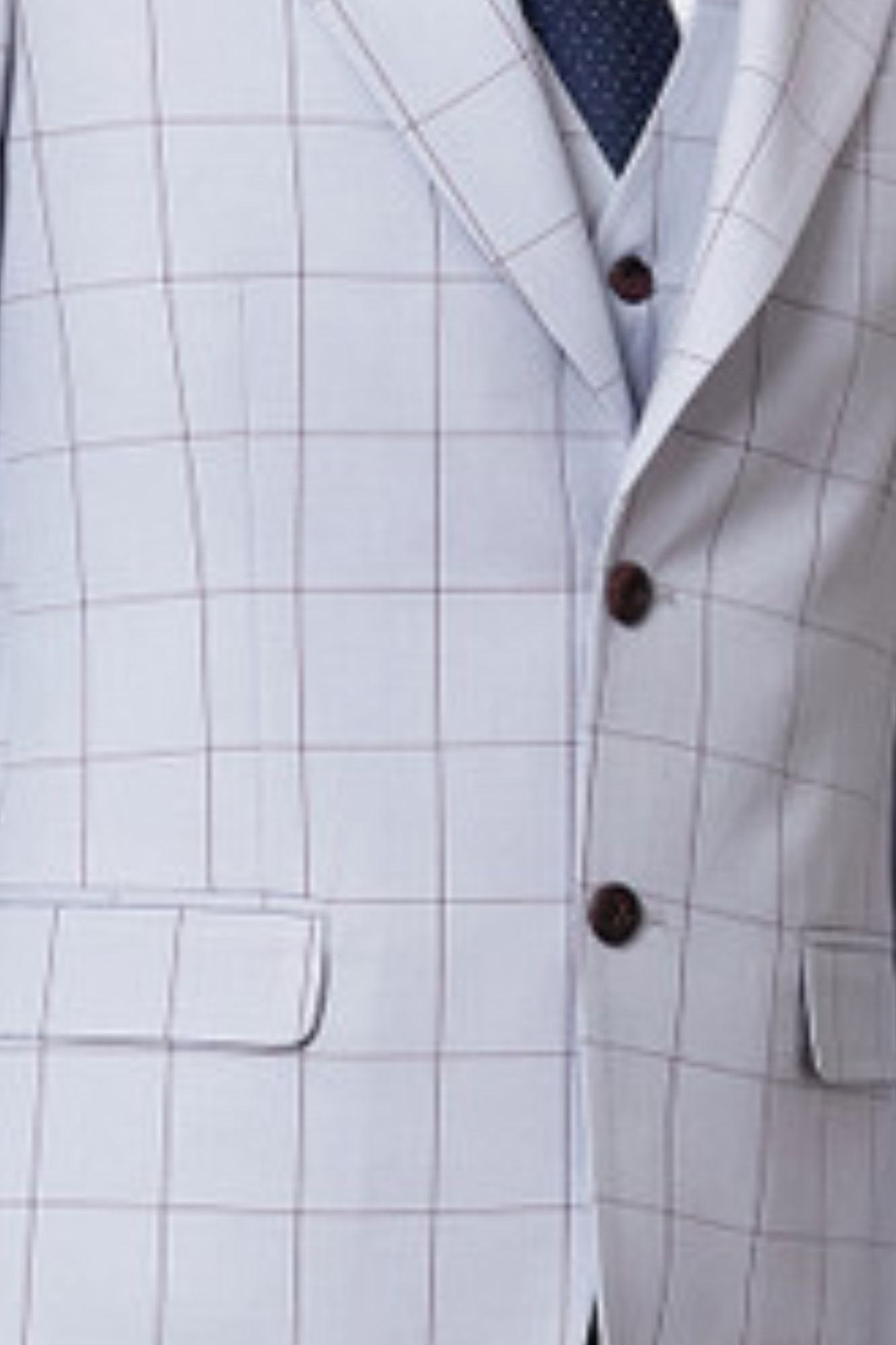 - Matching Five-Button Vest: The vest complements the jacket with its windowpane pattern and side pockets, adding an extra layer of elegance.
