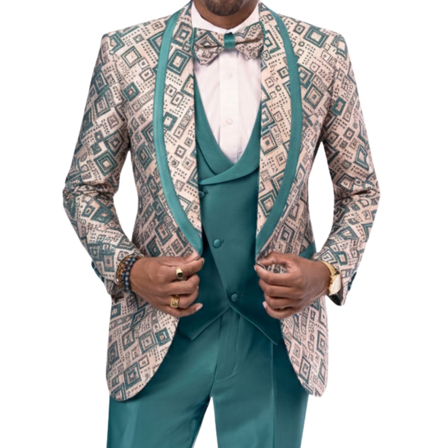 Savonniere Blue Teal 3-Piece Geometric Fashion Suit with Matching Bowtie