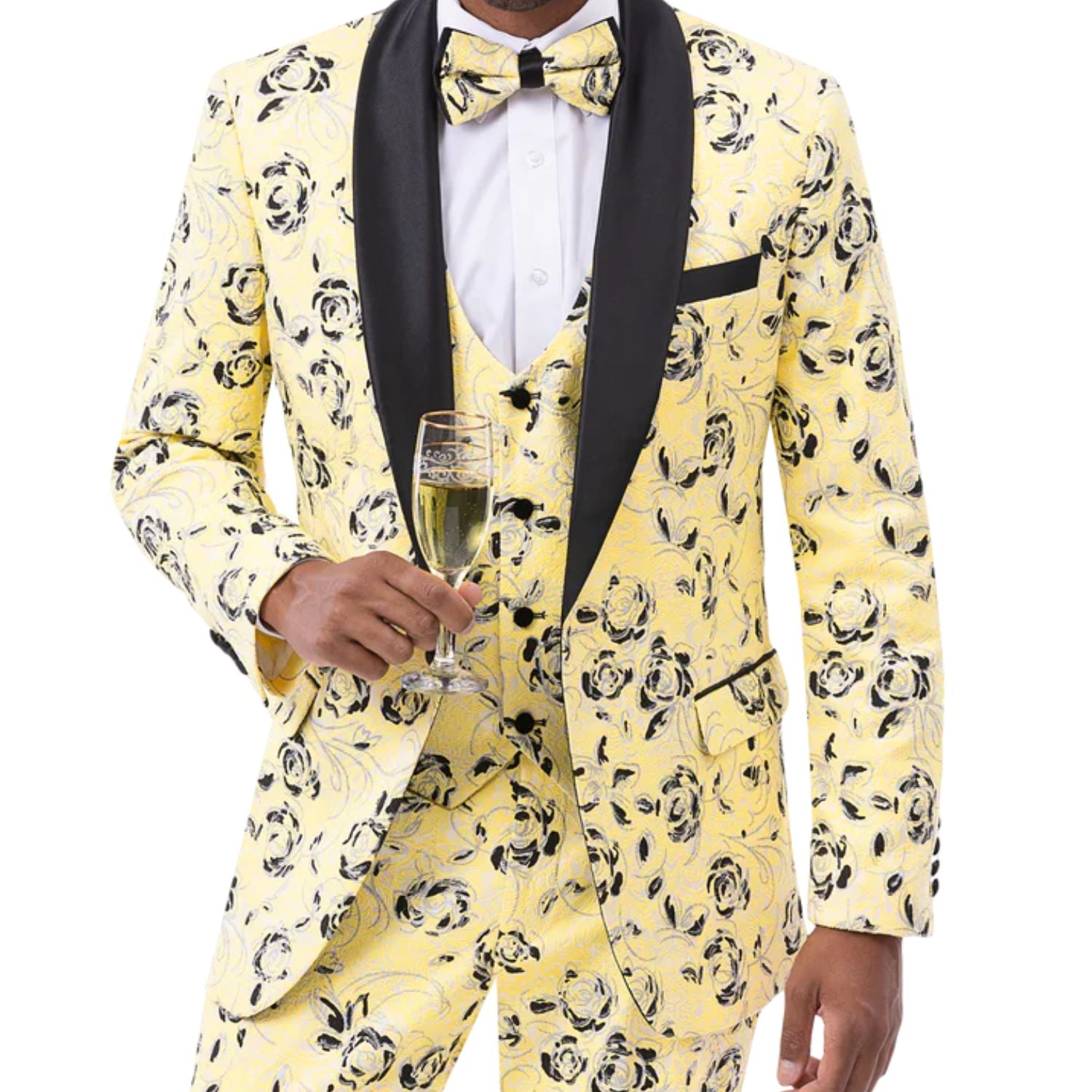 Lazuli Bloom Yellow 3-Piece Floral Print Fashion Suit with Matching Bowtie