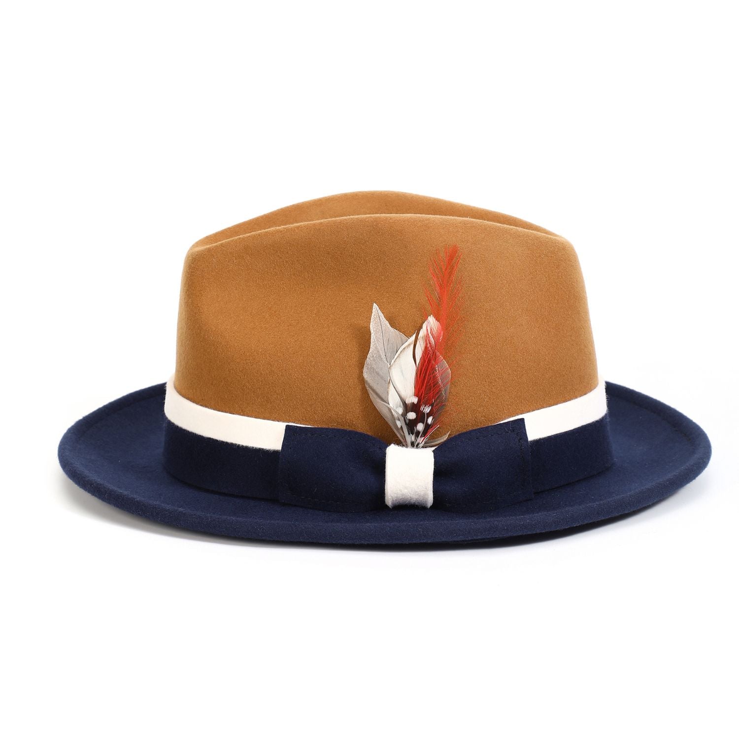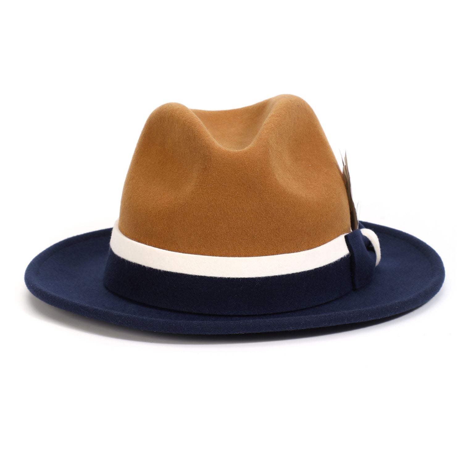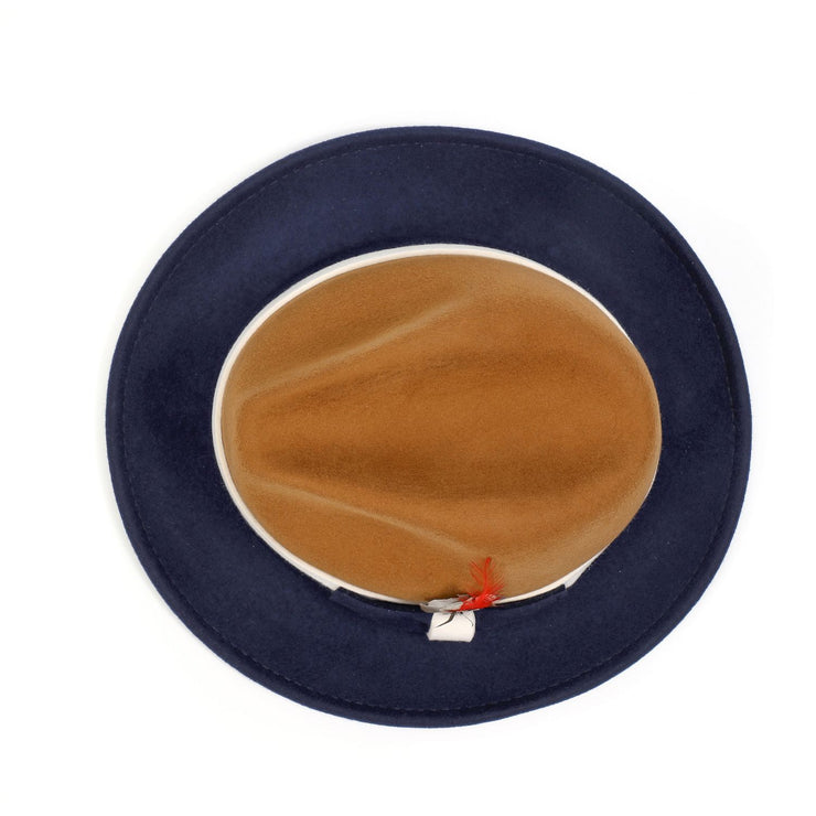 Caladan Collection: Montique Cappuccino-Navy Felt Fedora Hat with White Trim