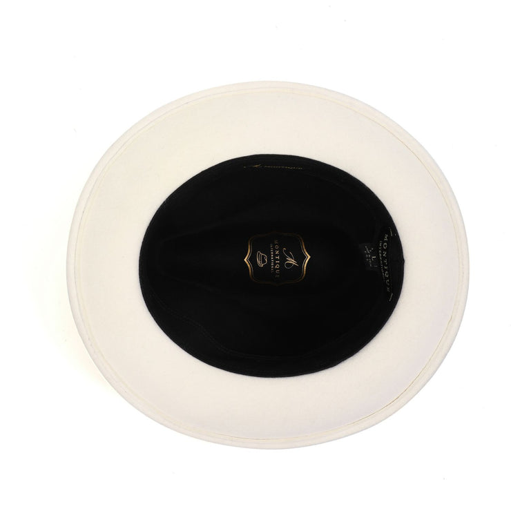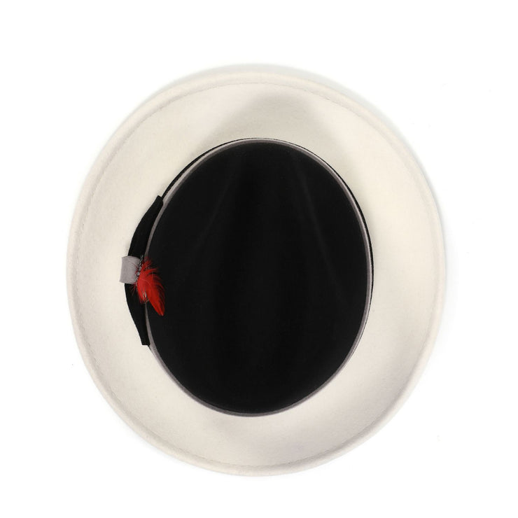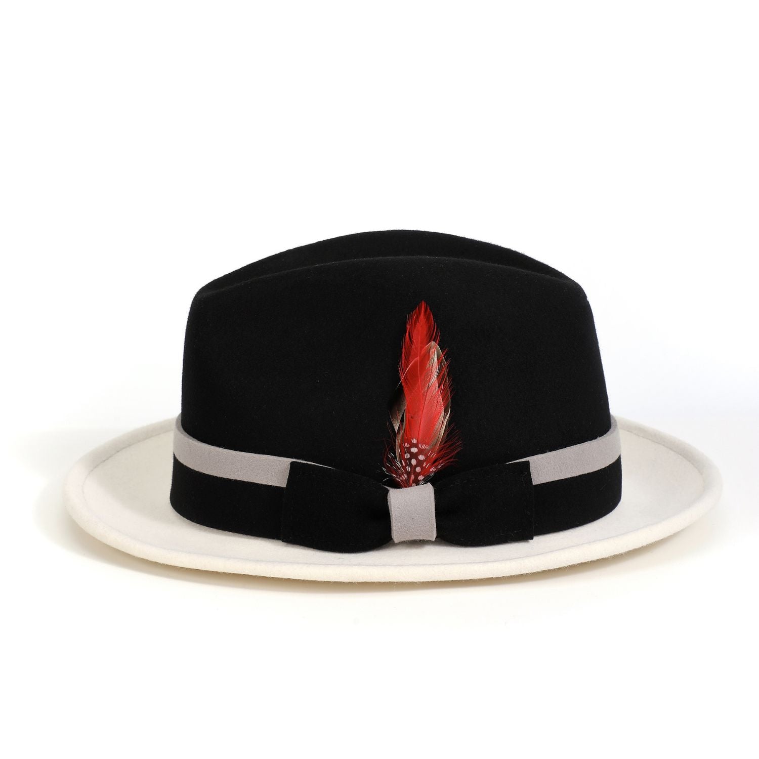 This Montique fedora brings monochrome to life with elegance and contrast. The crown is dressed in a rich black wool-feel felt, while the brim pops in clean winter white. A subtle grey grosgrain band wraps the base, perfectly tied with a bow detail and topped off with a red feather flourish for just the right touch of flair.