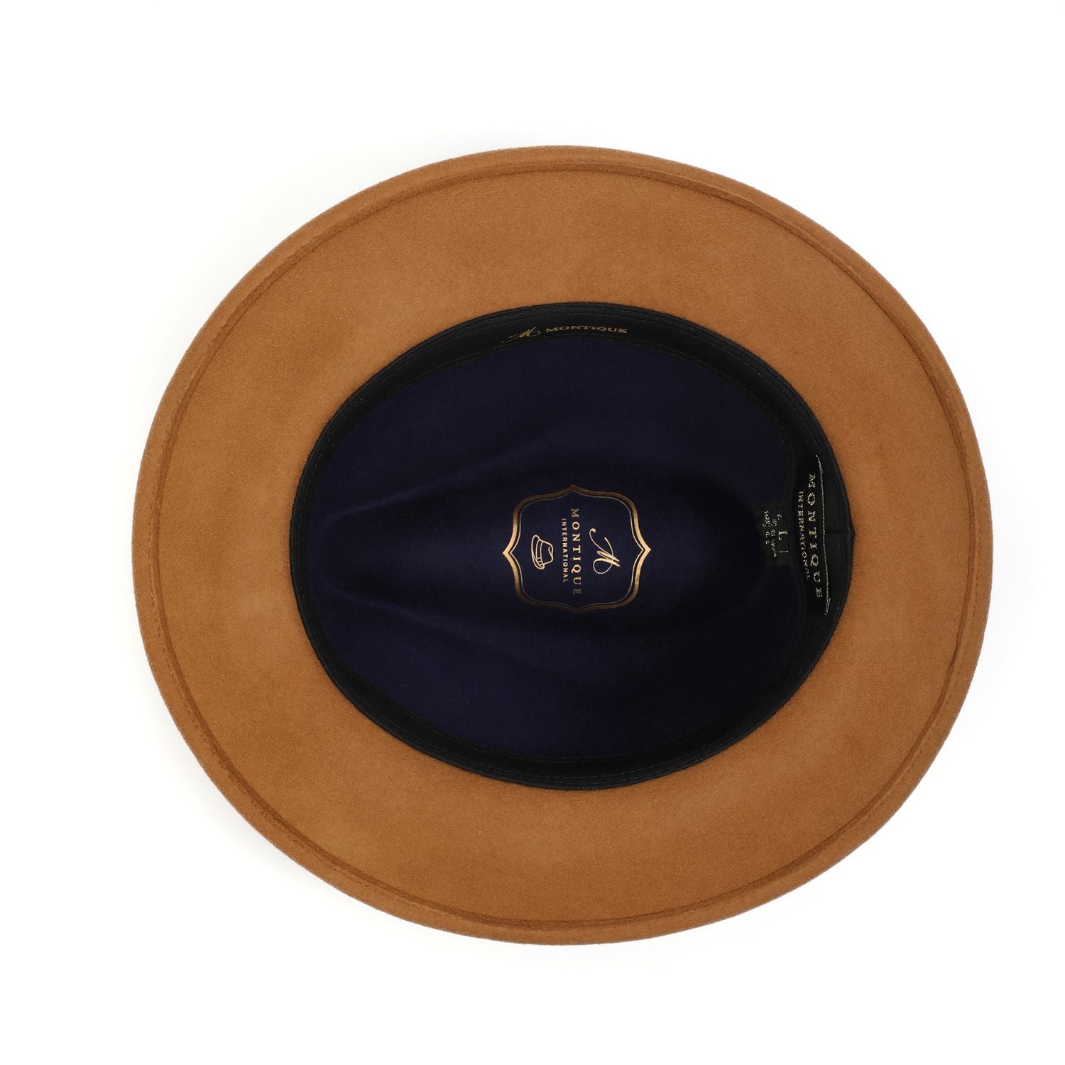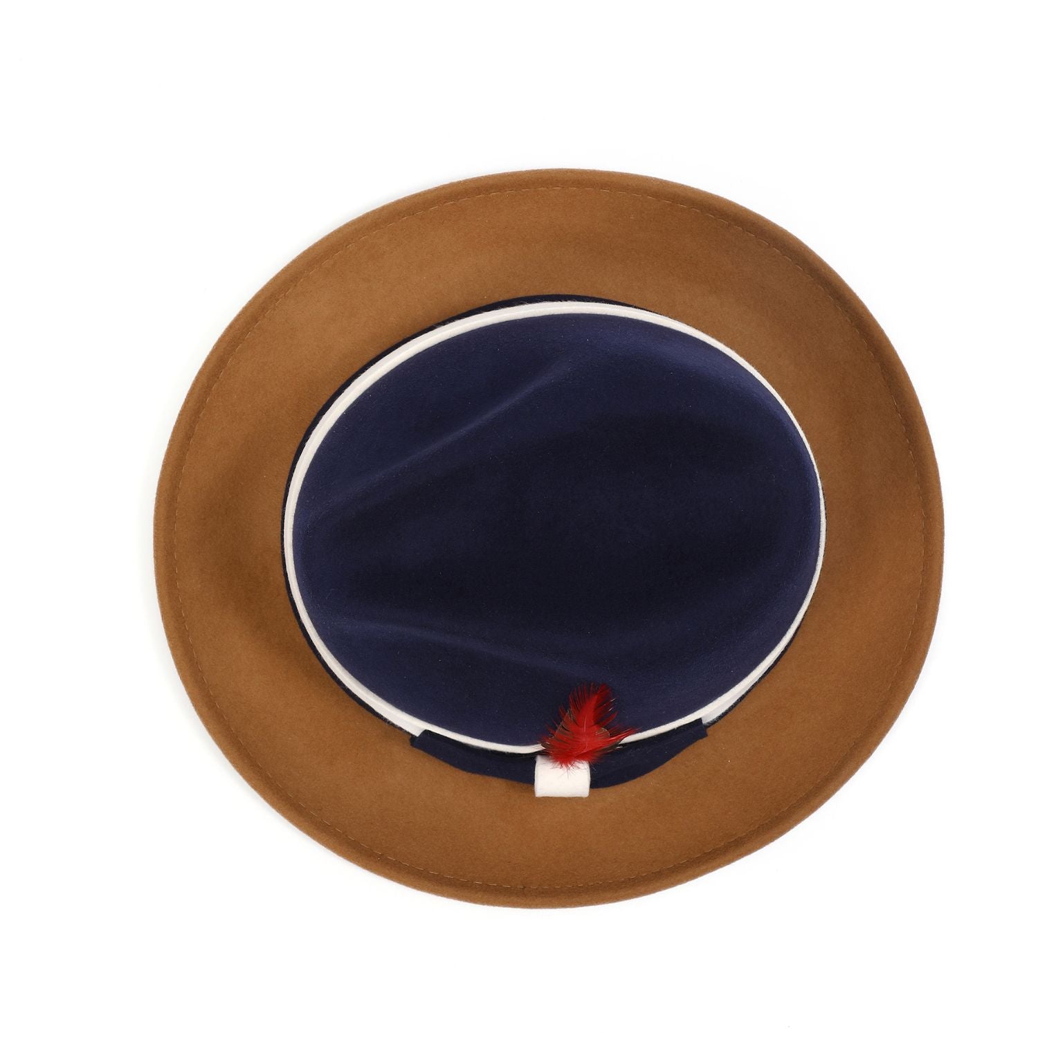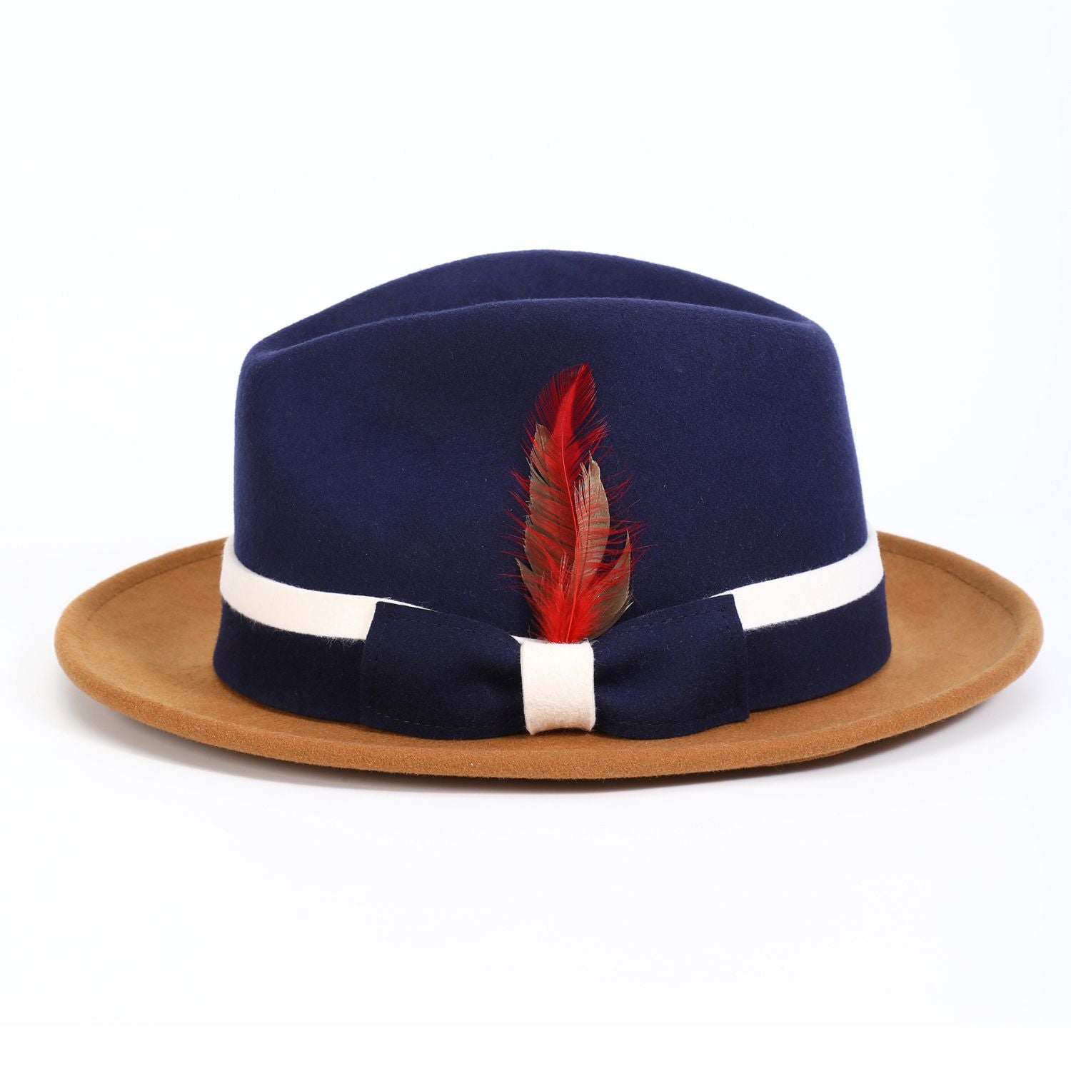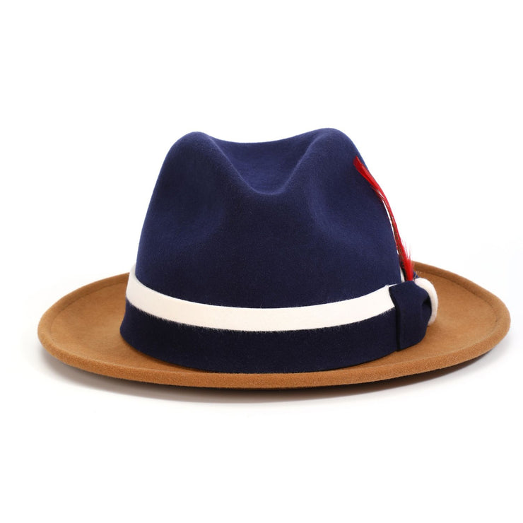 Corvus Collection: Montique Navy & Cappuccino Felt Fedora with White Band and Feather