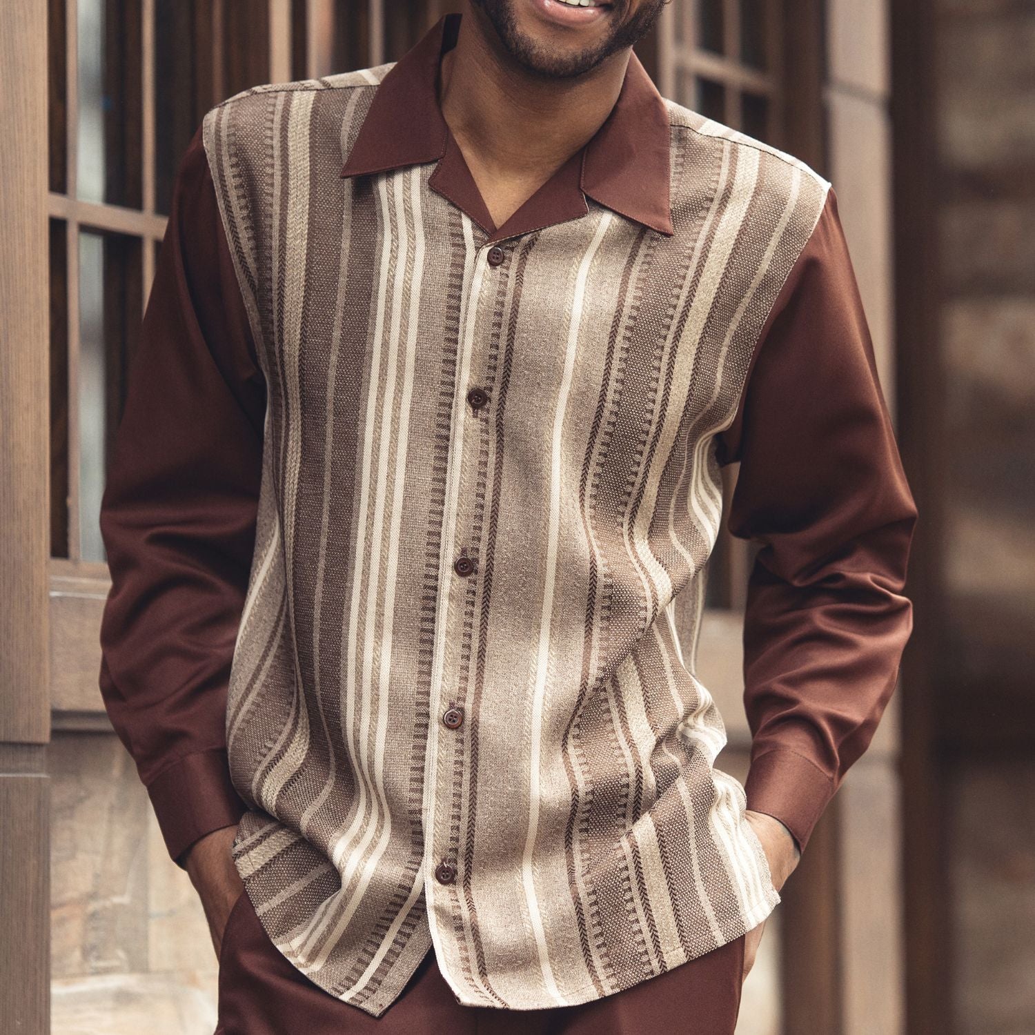 The Stride Collection is all about confident style and refined comfort. This Montique long sleeve 2-piece walking suit set features a vertical stripe patterned shirt with subtle textured details, paired seamlessly with matching pants for a coordinated and polished look. Designed for both casual settings and upscale occasions, it blends sophistication with effortless wearability.