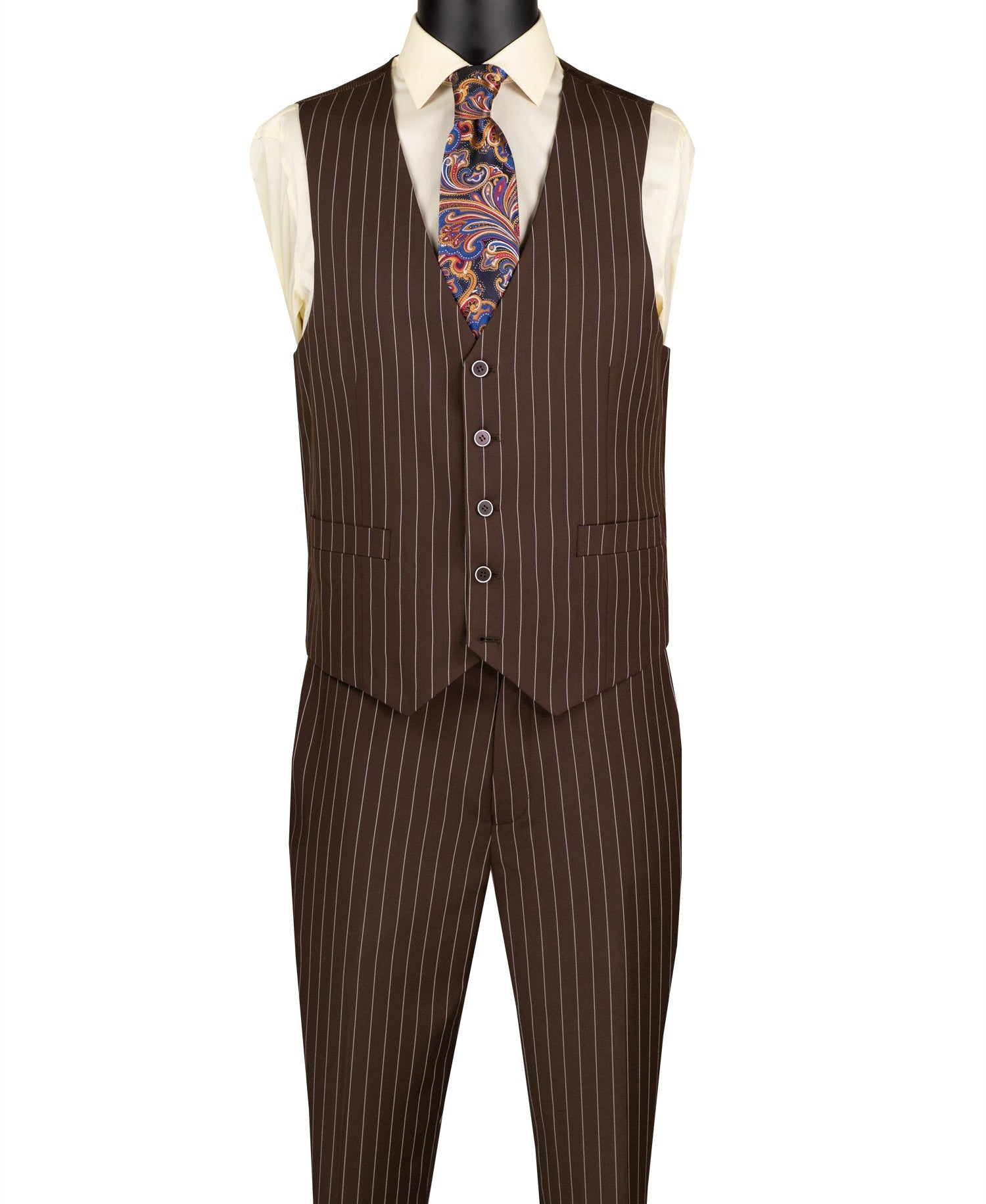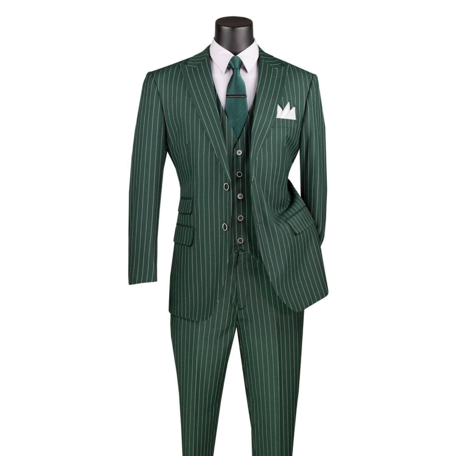 The Suitania Collection captures timeless class with a bold twist. This three-piece suit features a gangster stripe pattern woven into a luxurious wool-feel fabric, delivering both vintage flair and modern comfort. The single-breasted jacket with a peak lapel and two-button closure offers a structured silhouette, while the matching five-button vest and flat-front pants complete the tailored ensemble. Whether you're headed to a formal event or looking to sharpen your everyday wardrobe, the Suitania Collection brings sophistication to every step.
