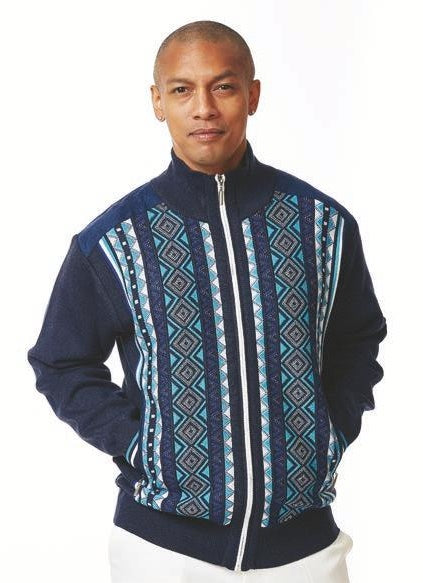 Verdanti Collection: Men’s Brown Geometric Knit Zip Sweater with Suede Patches