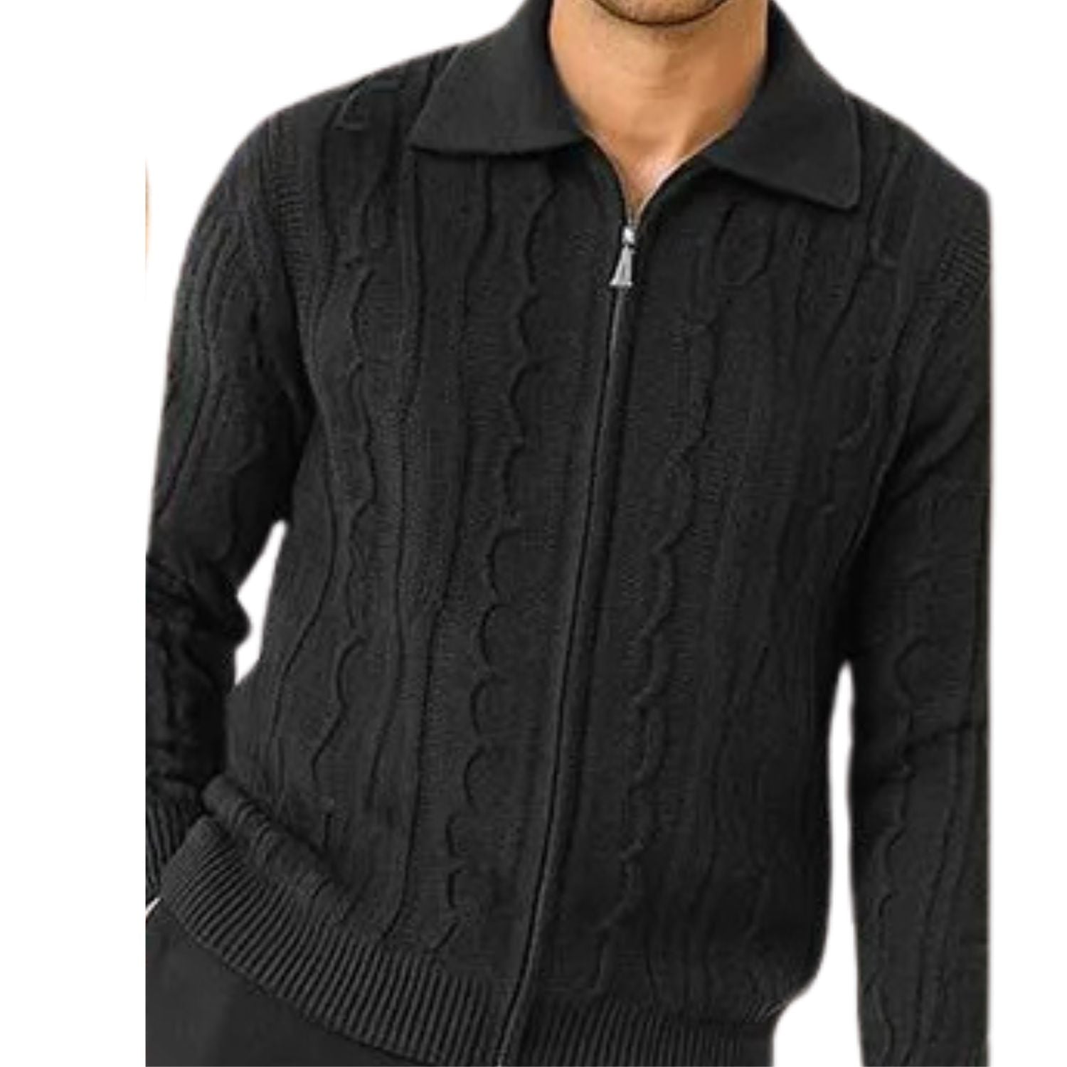 Siro Collection: Black Wool Blend Zip Collar Sweater with Vertical Geometric Pattern