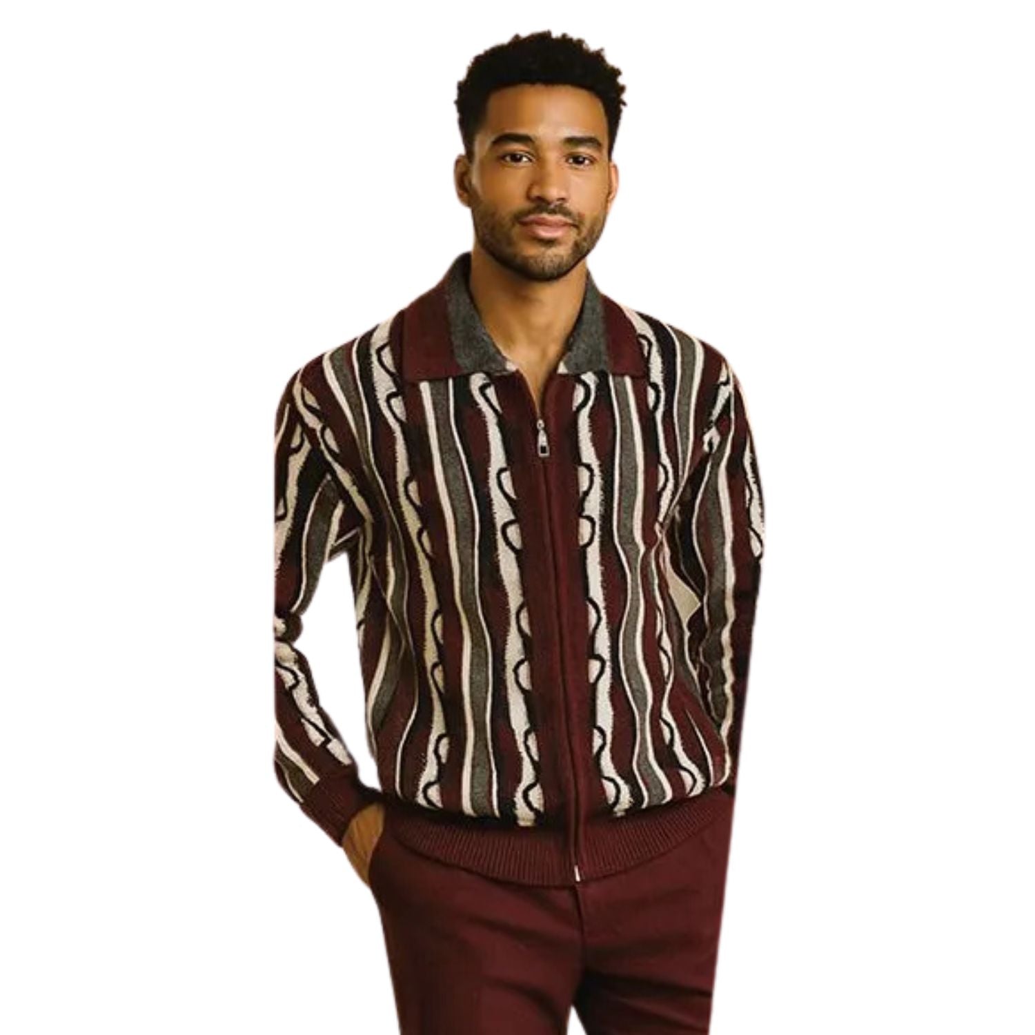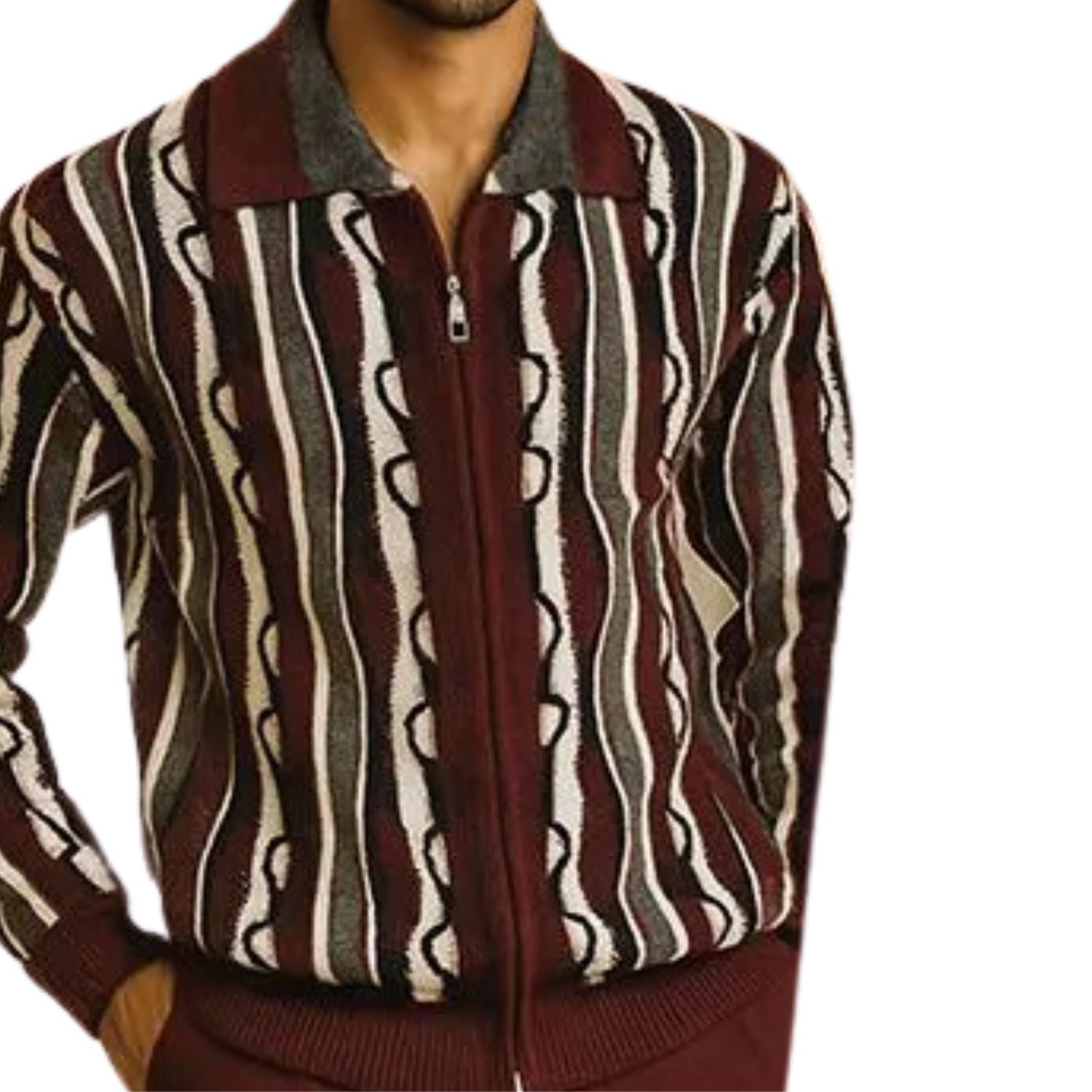 Siro Collection: Black & Fig Wool Blend Zip Collar Sweater with Vertical Geometric Pattern