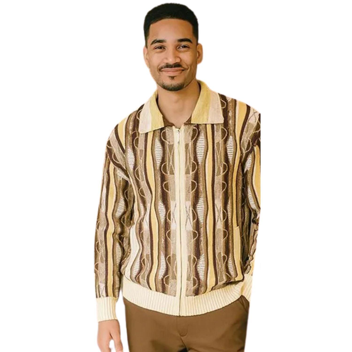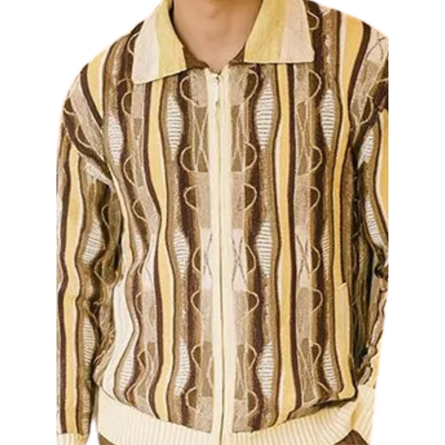 Siro Collection: Cream & Brown Wool Blend Zip Collar Sweater with Vertical Geometric Pattern