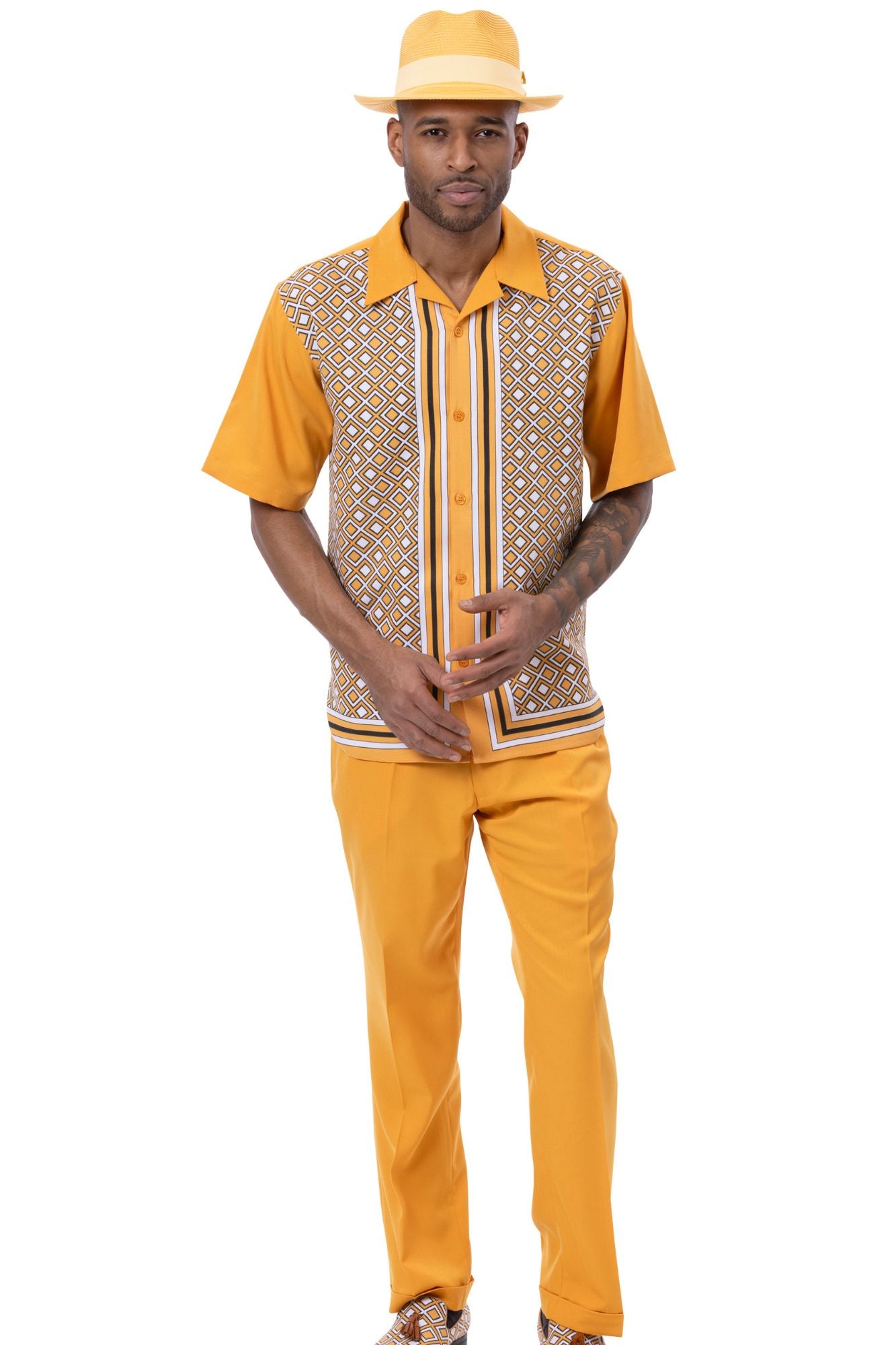 Introducing the Gold Montique Walking Suit, where timeless style meets modern sophistication. This exquisite set showcases a symmetrical argyle design, offering an upscale twist on classic menswear. Crafted for those who seek to blend comfort with impeccable style, this walking suit set is a standout choice for any distinguished gentleman.