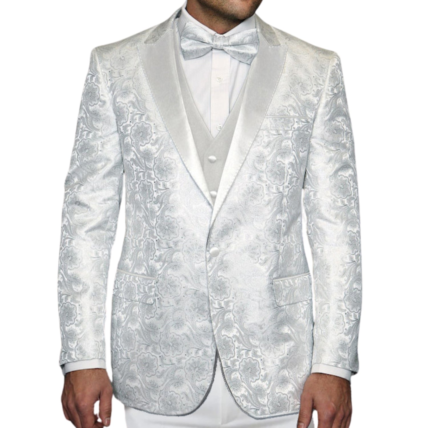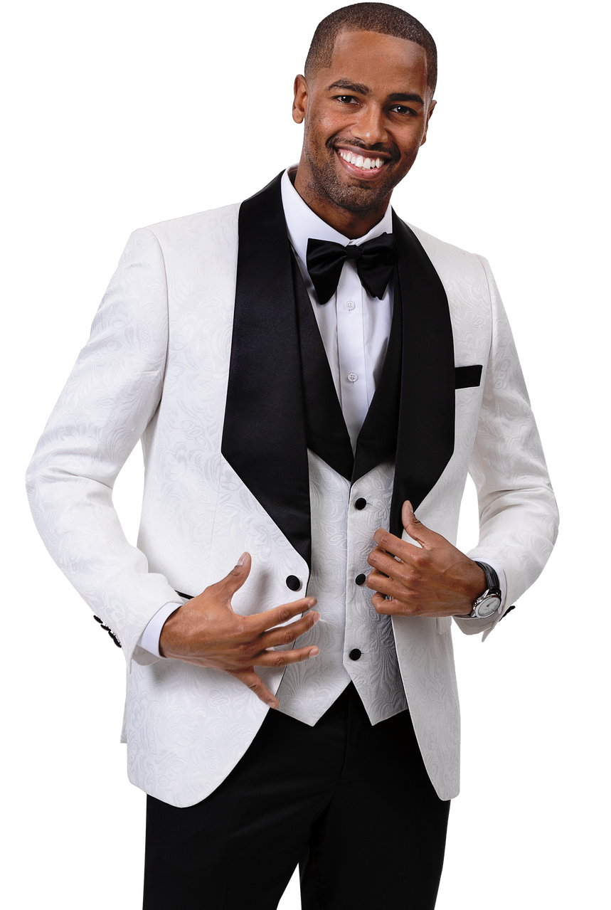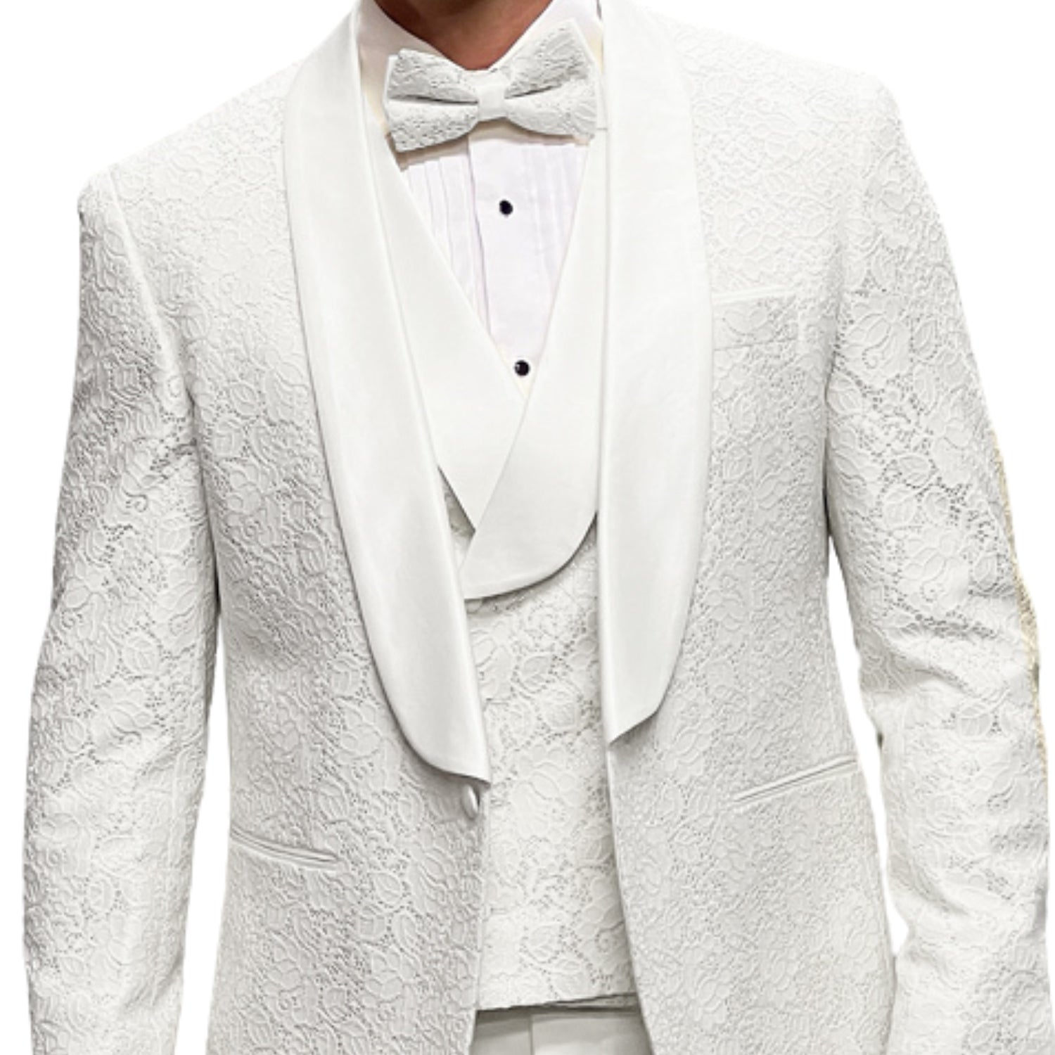 Slickora Collection: White 3-Piece Fancy Lace Tuxedo with Double-Breasted Vest