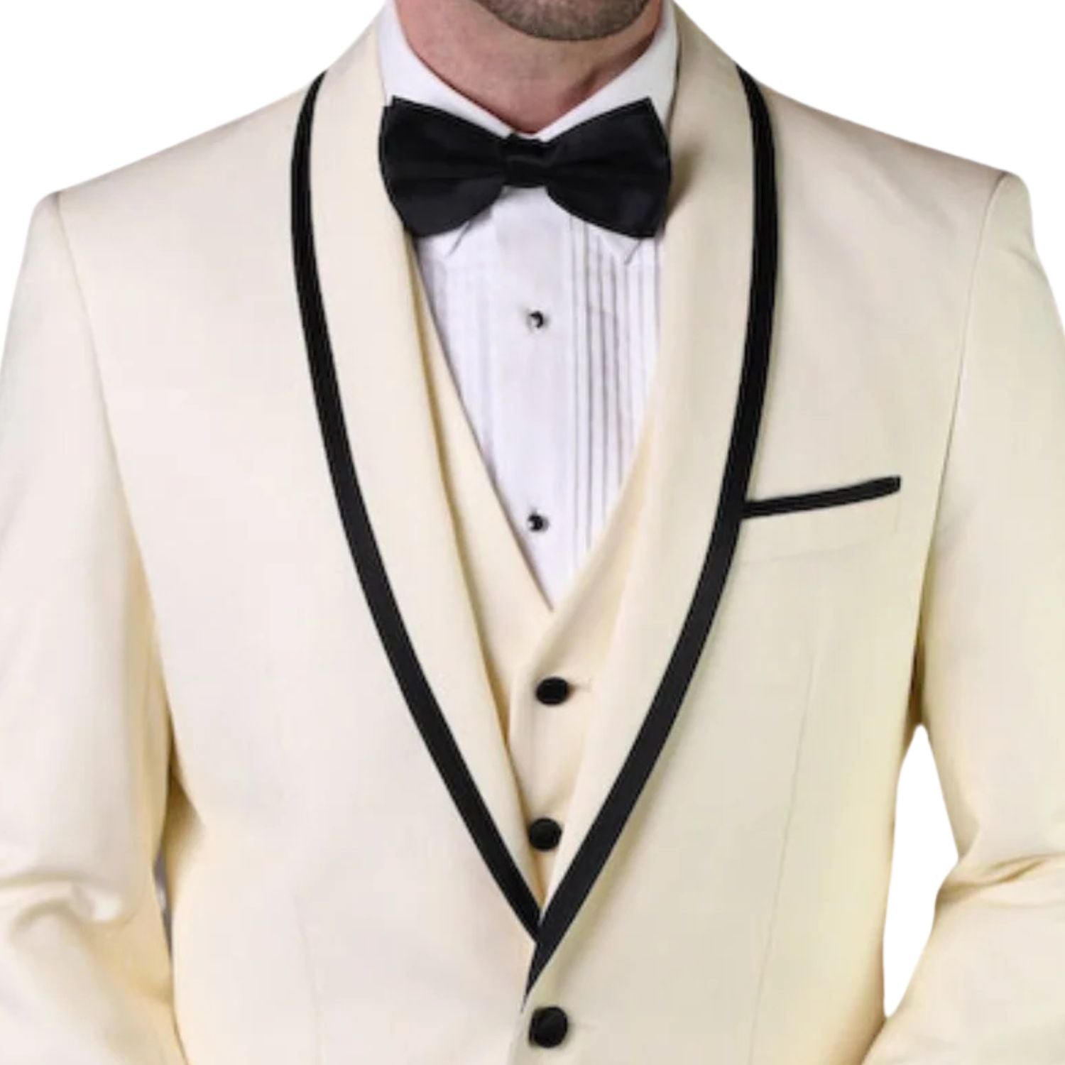 This suit is built in a tailored fit with a structured jacket, matching vest, and flat front pants. The 100% wool fabric helps the suit hold a cleaner shape while keeping the finish dressy and polished. The contrast lapel trim and included bow tie make this a stronger formal option than a standard 3-piece suit.