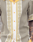 Stand out in the Montique Andromeda Collection with this gold walking suit, featuring a short-sleeve button-down shirt and matching pants. The striking vertical stripes and ornate accents bring a fresh, vibrant look, while the adjustable waistband ensures all-day comfort. It’s the perfect choice for occasions that call for an extra pop of style without sacrificing ease.